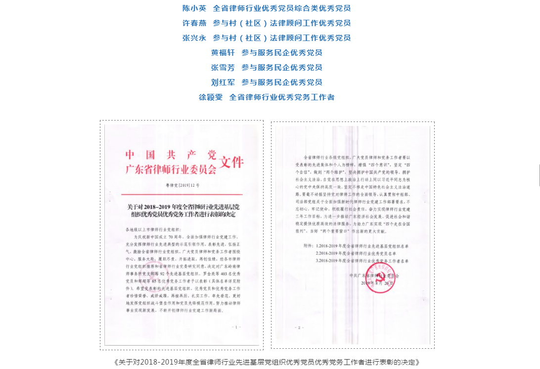 近日,中共广东省律师行业委员会发布了《关于对2018-2019年度全省律师行业先进基层党组织优秀党员优秀党务工作者进行表彰的决定》(粤律党[2019]12号)(以下简称“《决定》”),广东广信君达律师事务所、广东广信君达(东莞)律师事务所共计7名党员律师受广东省律师行业党委表彰,分获“全省律师行业优秀党员综合类优秀党员”“参与村(社区)法律顾问工作优秀党员”“参与服务民企优秀党员”“全省律师行业优秀党务工作者”等荣誉称号。