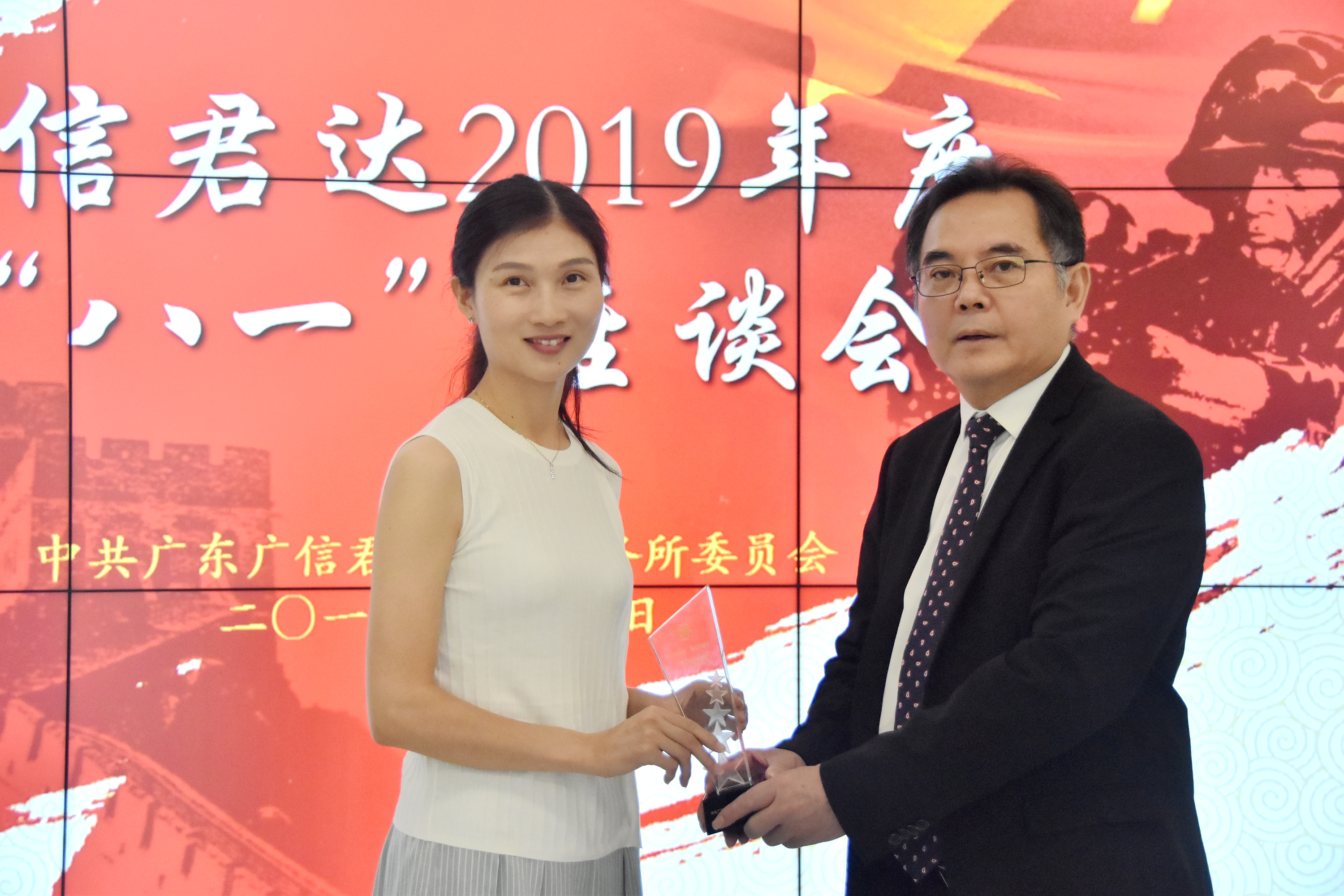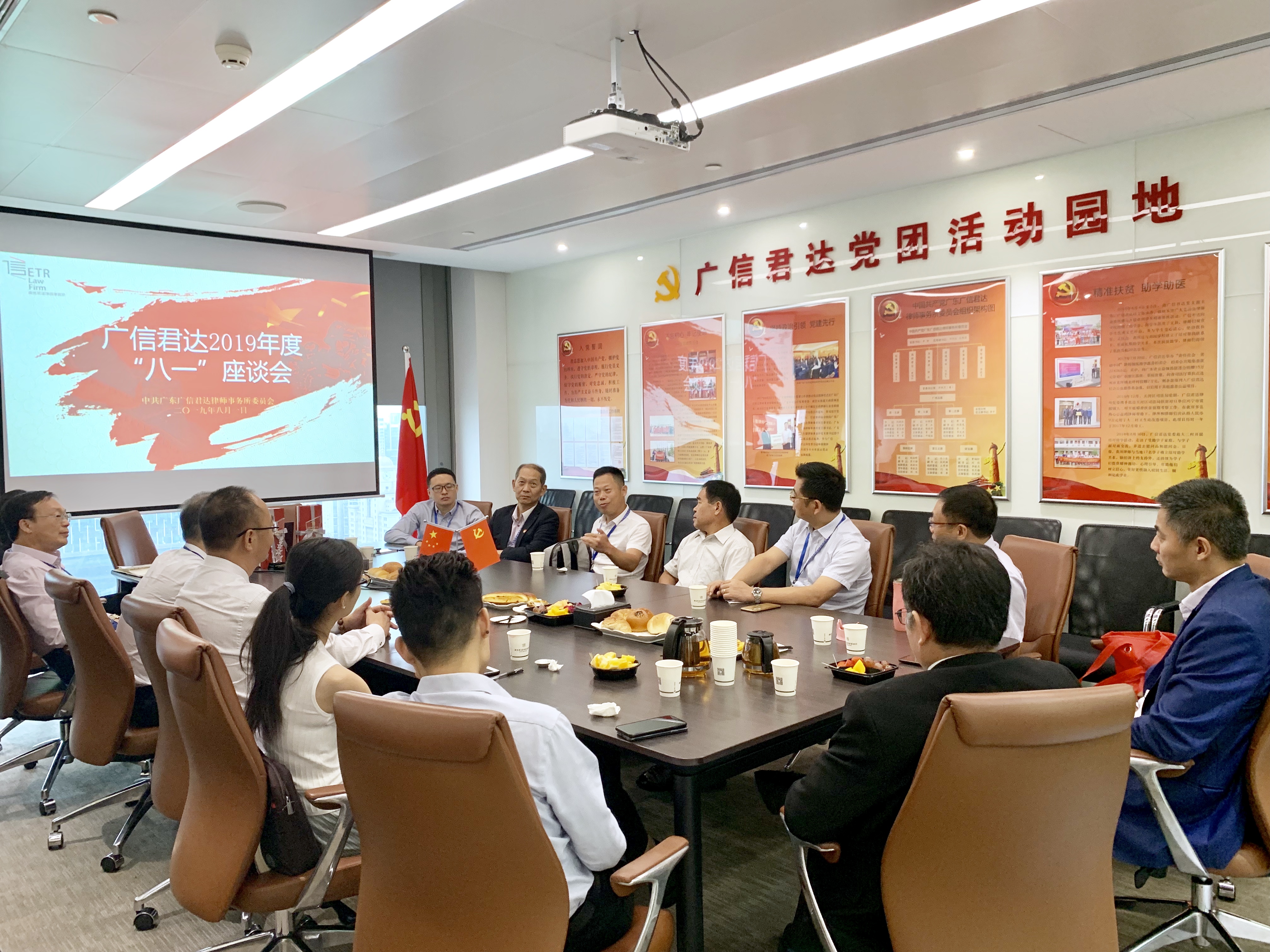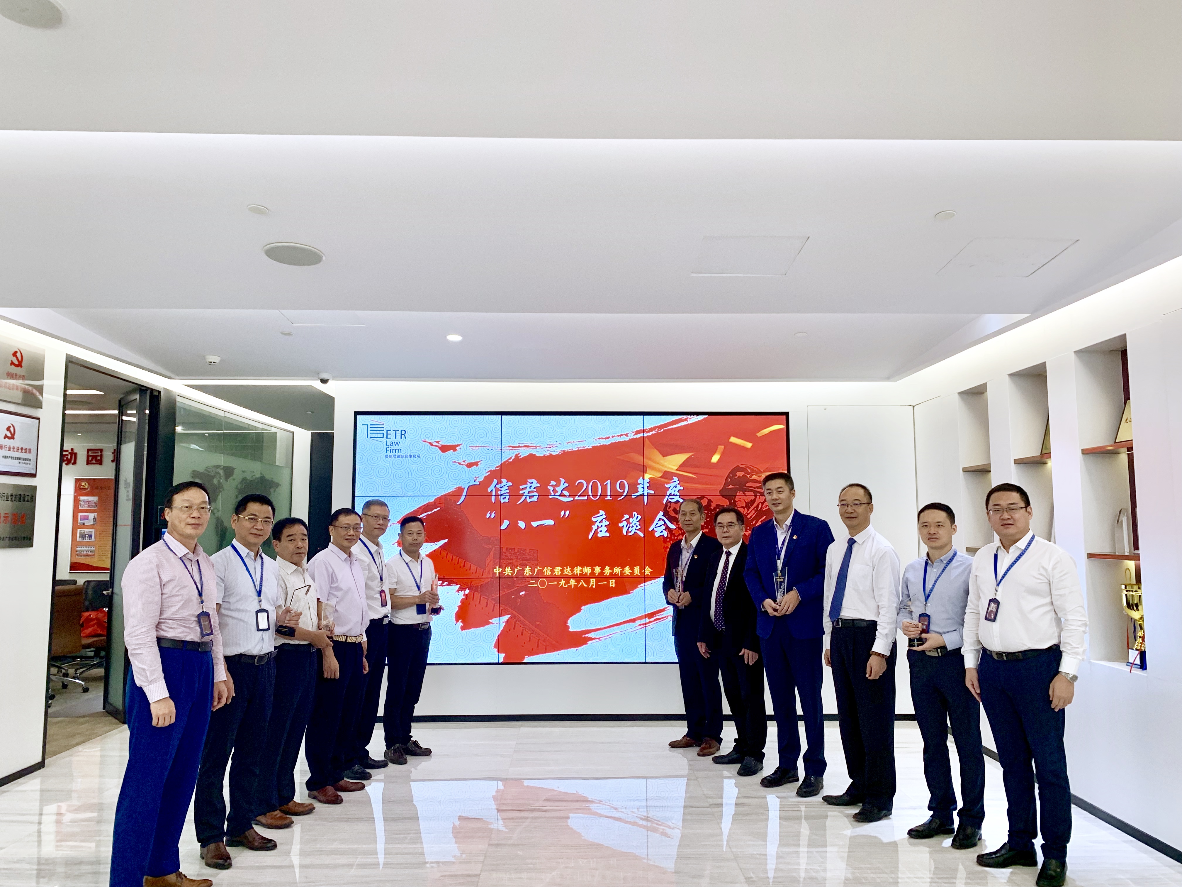 2019年8月1日,值此中国人民解放军建军92周年到来之际,为深入贯彻习近平总书记关于退役军人工作重要论述,结合广信君达党委关于开展“不忘初心、牢记使命”主题教育的部署,关心退役军人工作和生活,营造全所尊崇、关爱退役军人的浓厚氛围,广东广信君达律师事务所党委召开2019年度“八一”座谈会。座谈会由广信君达党委书记章勋主持,合伙人会议主席王晓华,管委会主任苏东海,监事长刘善巧,党委副书记邓传远,管委会成员孙俊杰,党委委员、团支部书记黄福轩等参加座谈会。本所退役军人代表刘兵会律师、蔡长建律师、蒋建凡律师、刘曦律师、执行顾问乔胜军、执行总监王永航,军人家属代表闫瑞律师等受邀与会分享。
