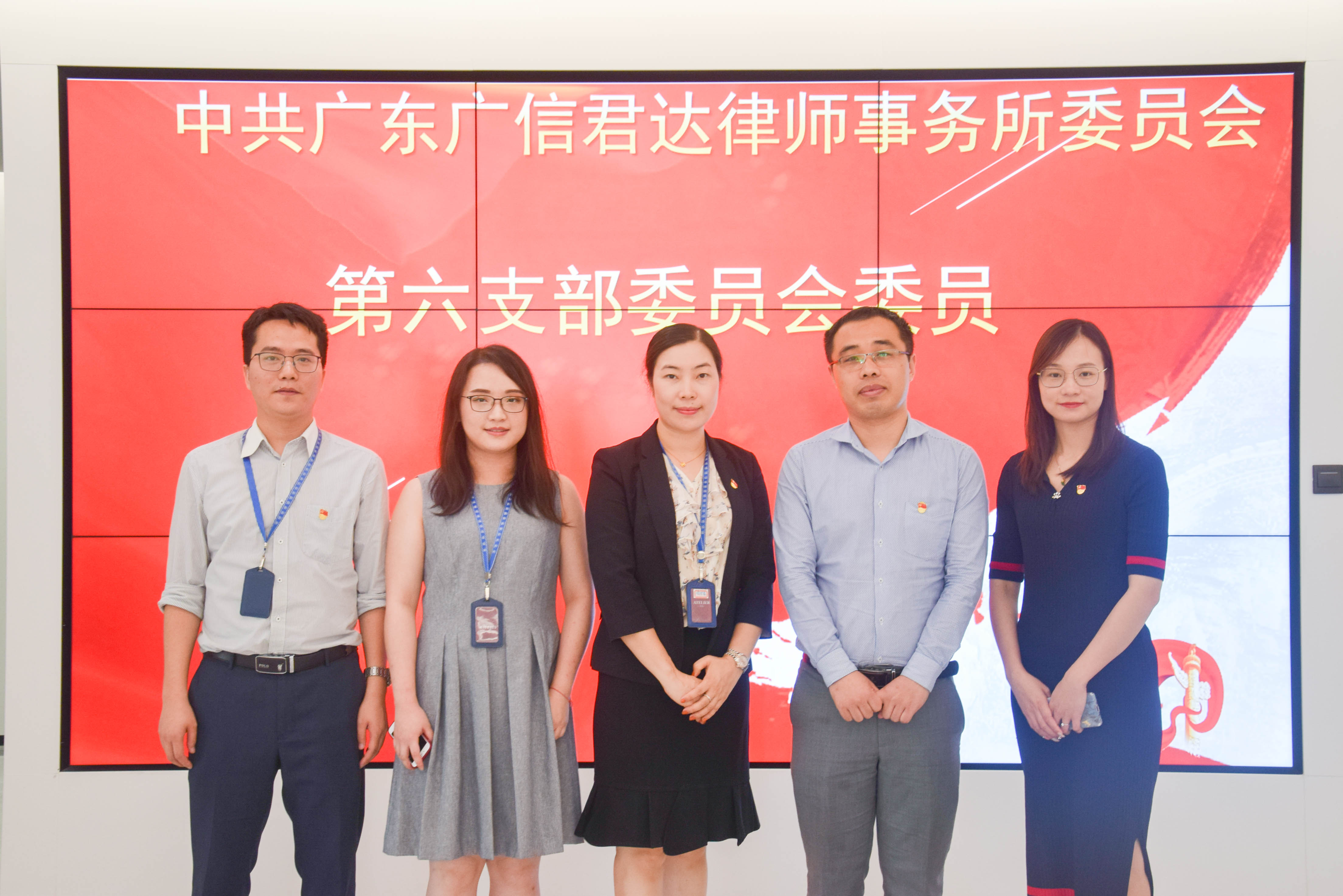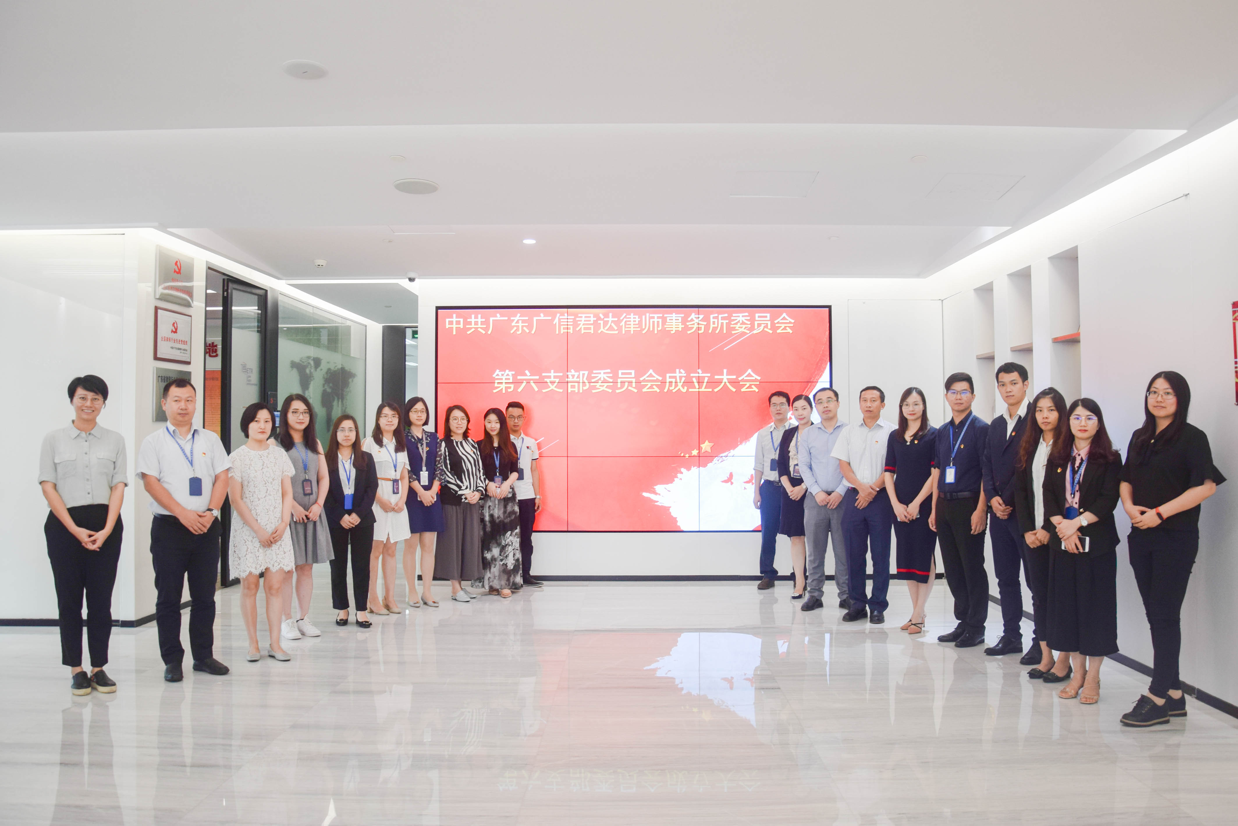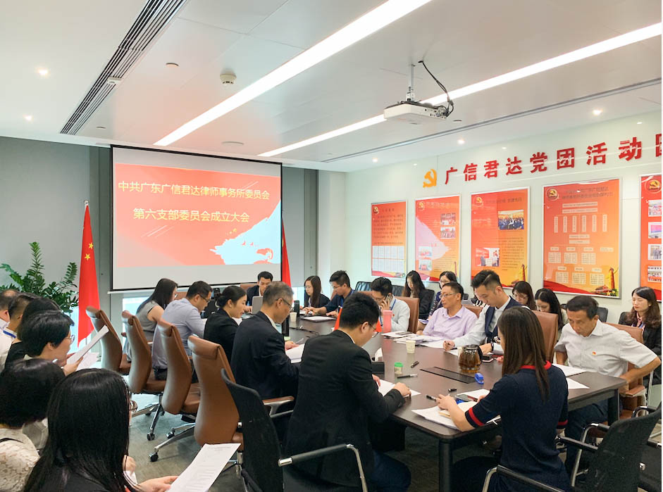 2019年6月25日,中共广东广信君达律师事务所委员会第六支部委员会(简称“第六党支部”)成立大会在党团活动室顺利召开。第六党支部的成立,标志着广信君达党委基层党建工作再上新台阶,为广信君达进一步探索律师行业特色的基层党组织建设工作奠定了更加坚实的基础。