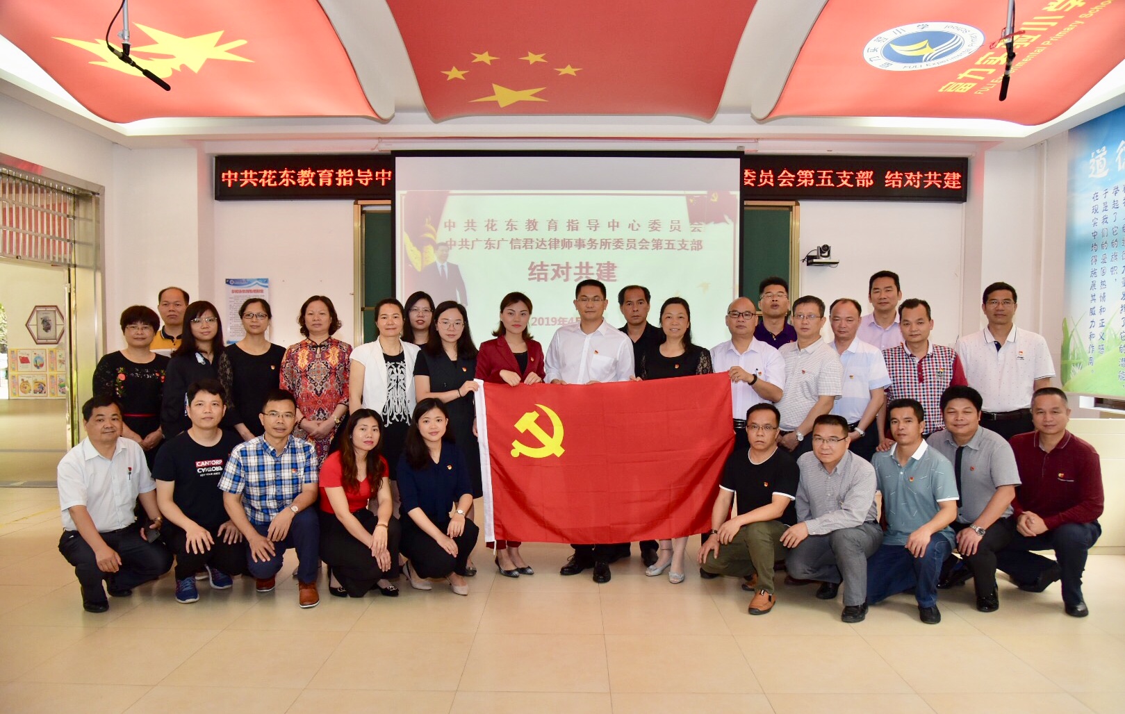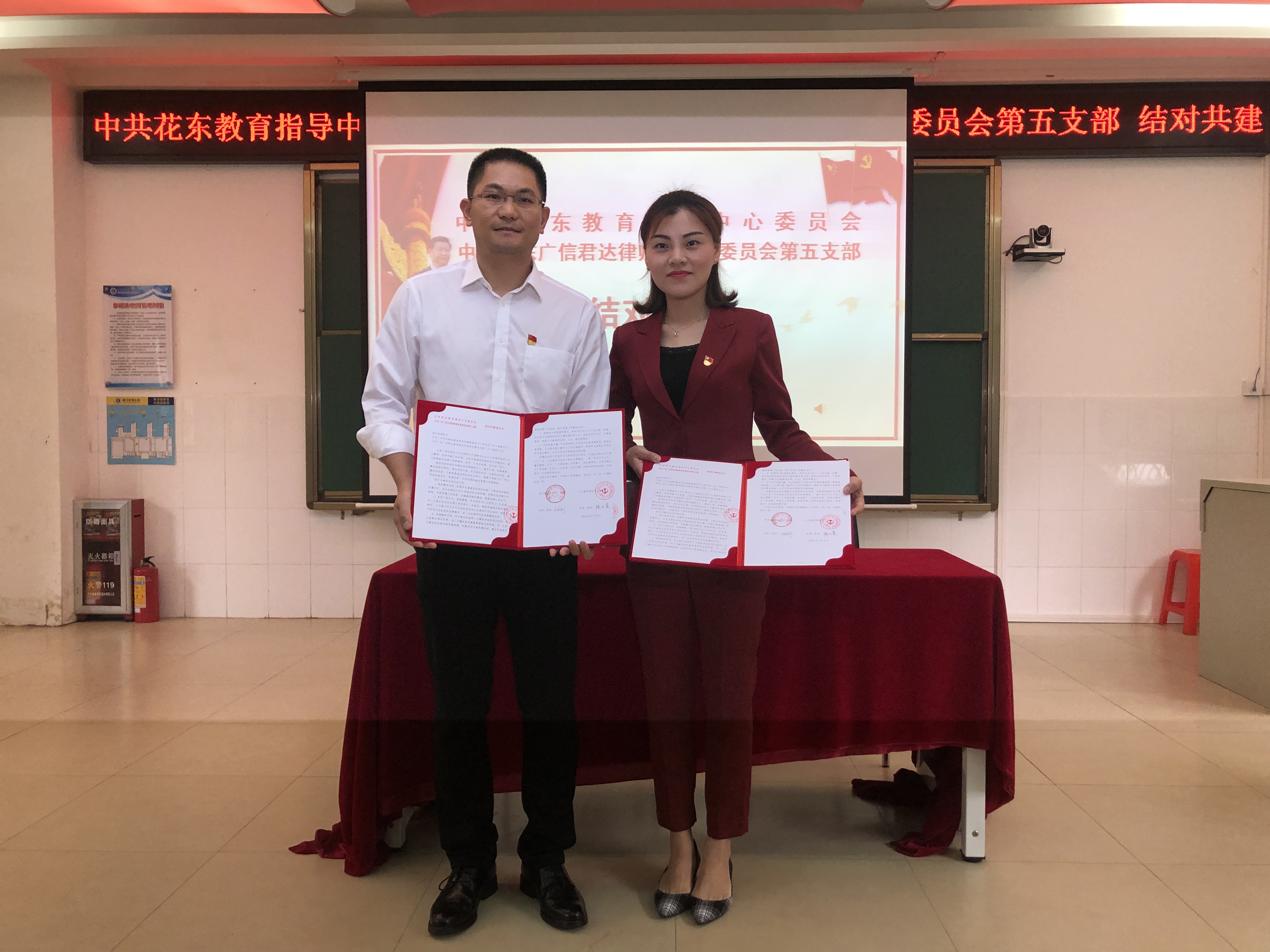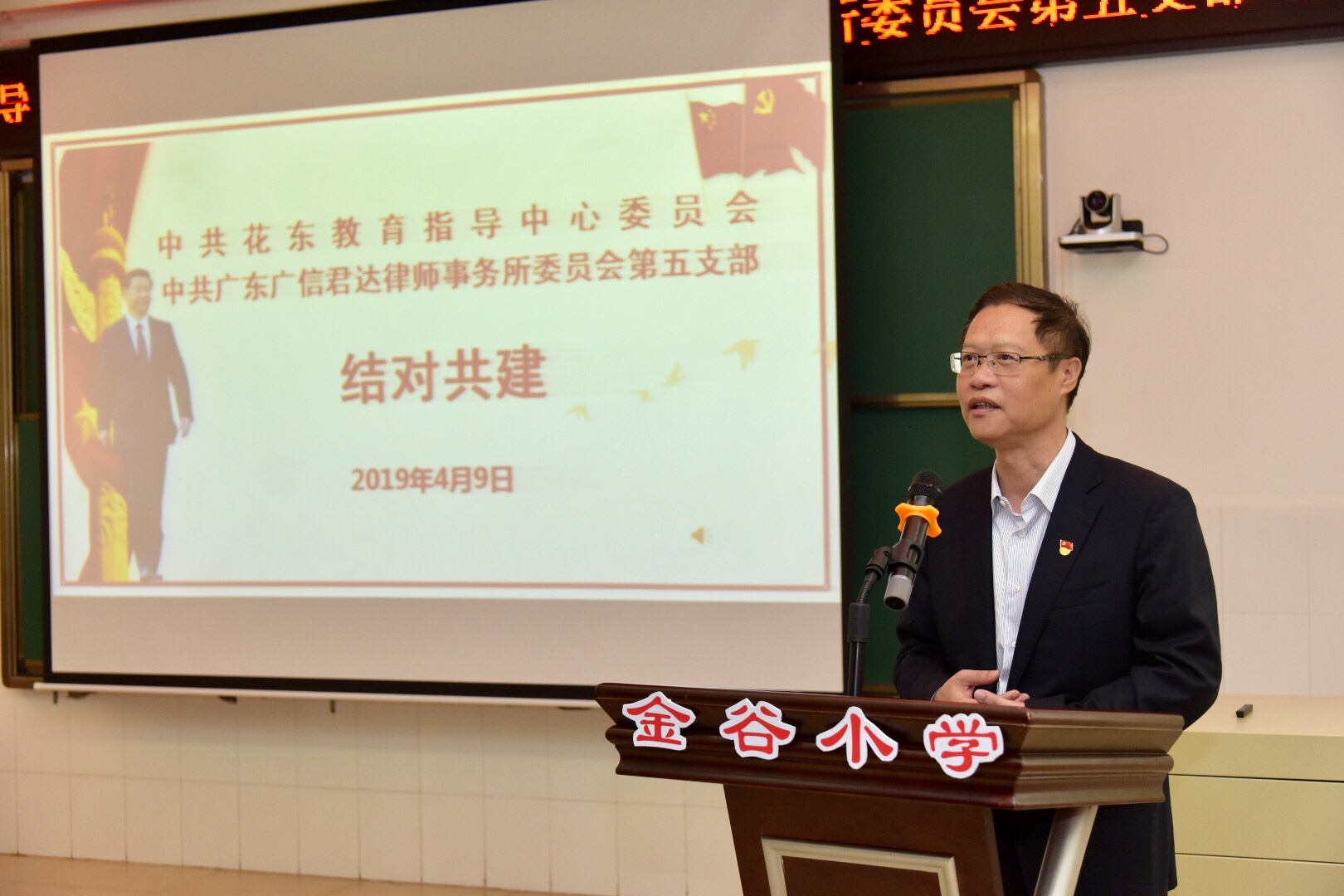 为积极响应习近平总书记在全国教育大会上关于“教育是国之大计、党之大计。”的重要讲话精神,全面贯彻教育部部长陈宝生在全国教育法治工作会议上作出的关于“教育战线要高度重视法治工作,加强党对教育法治工作的领导,形成全面推进教育法治工作的强大合力,让教育法治的作用真正发挥出来。”的重要指示,2019年4月9日上午,中共广州市花都区教育局花东教育指导中心委员会(以下简称“花东教育指导中心党委”)与中共广东广信君达律师事务所委员会第五党支部委员会(以下简称“广信君达第五党支部”)在花东镇金谷小学隆重举行党组织结对共建的签约仪式。