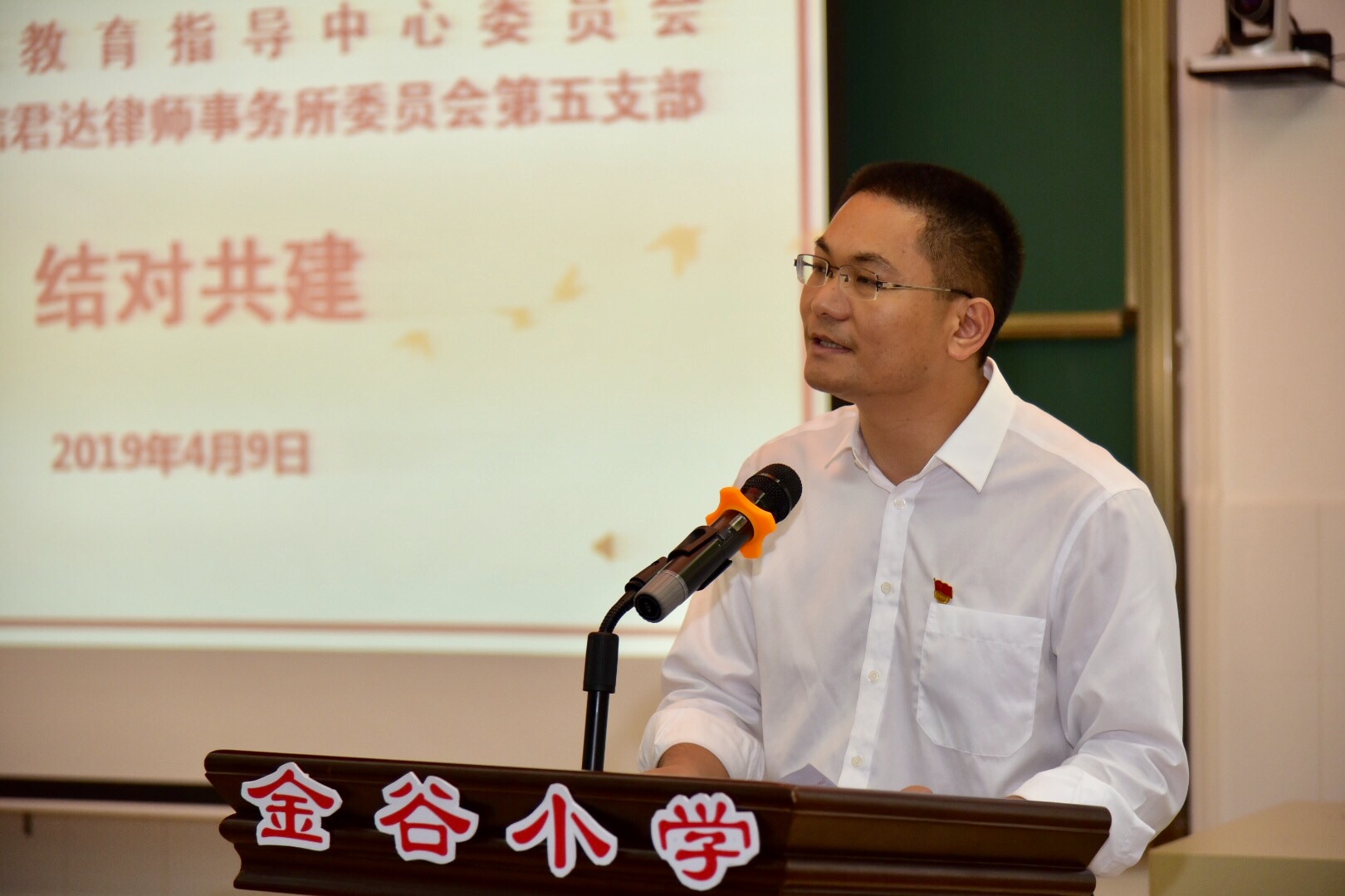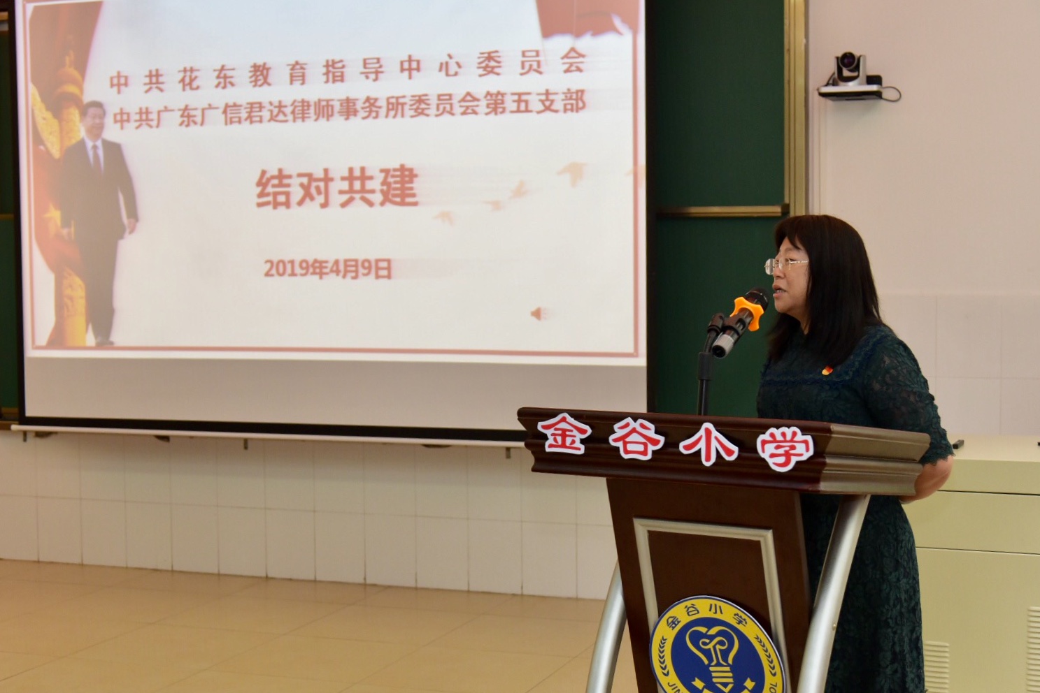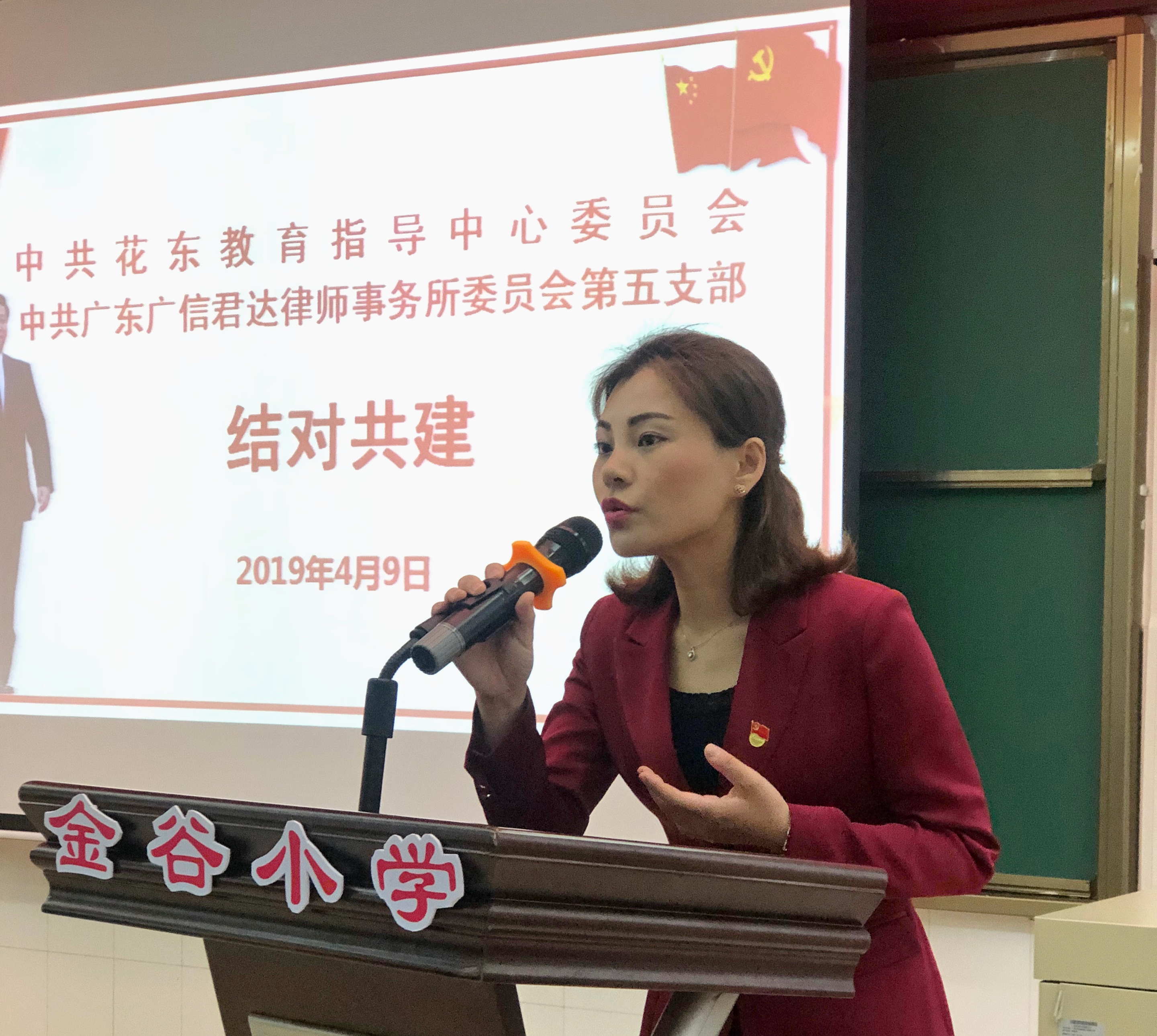 为积极响应习近平总书记在全国教育大会上关于“教育是国之大计、党之大计。”的重要讲话精神,全面贯彻教育部部长陈宝生在全国教育法治工作会议上作出的关于“教育战线要高度重视法治工作,加强党对教育法治工作的领导,形成全面推进教育法治工作的强大合力,让教育法治的作用真正发挥出来。”的重要指示,2019年4月9日上午,中共广州市花都区教育局花东教育指导中心委员会(以下简称“花东教育指导中心党委”)与中共广东广信君达律师事务所委员会第五党支部委员会(以下简称“广信君达第五党支部”)在花东镇金谷小学隆重举行党组织结对共建的签约仪式。