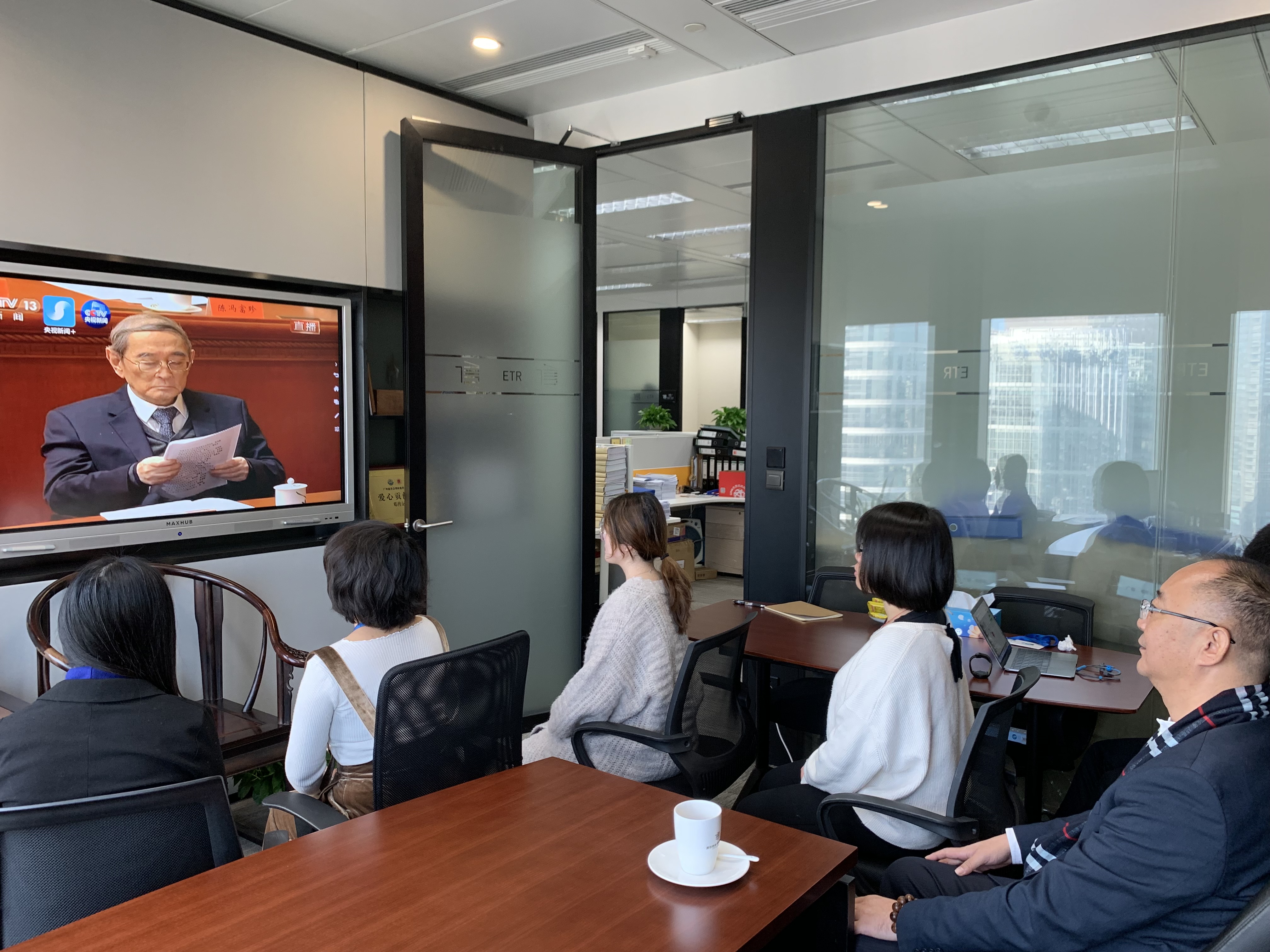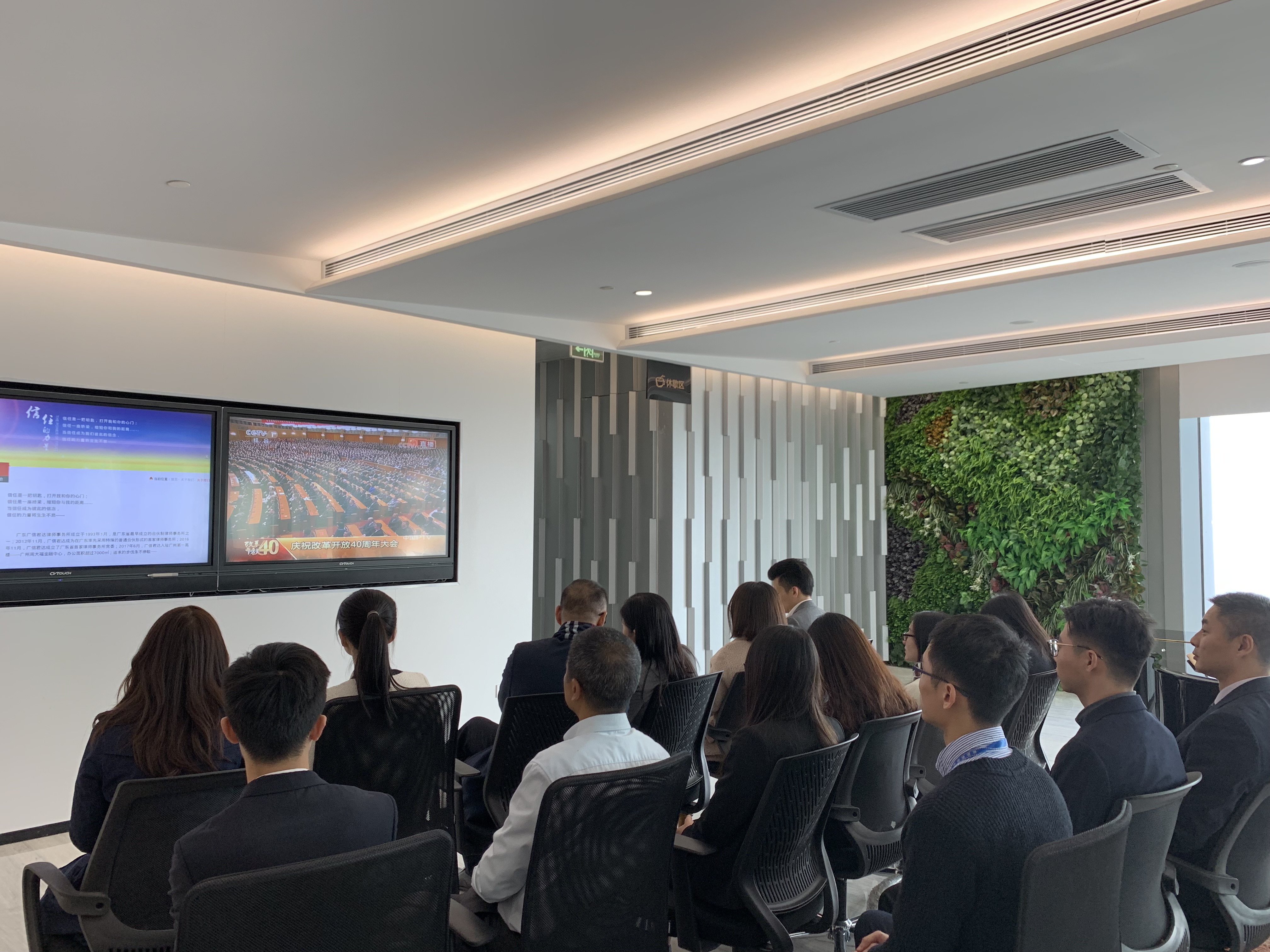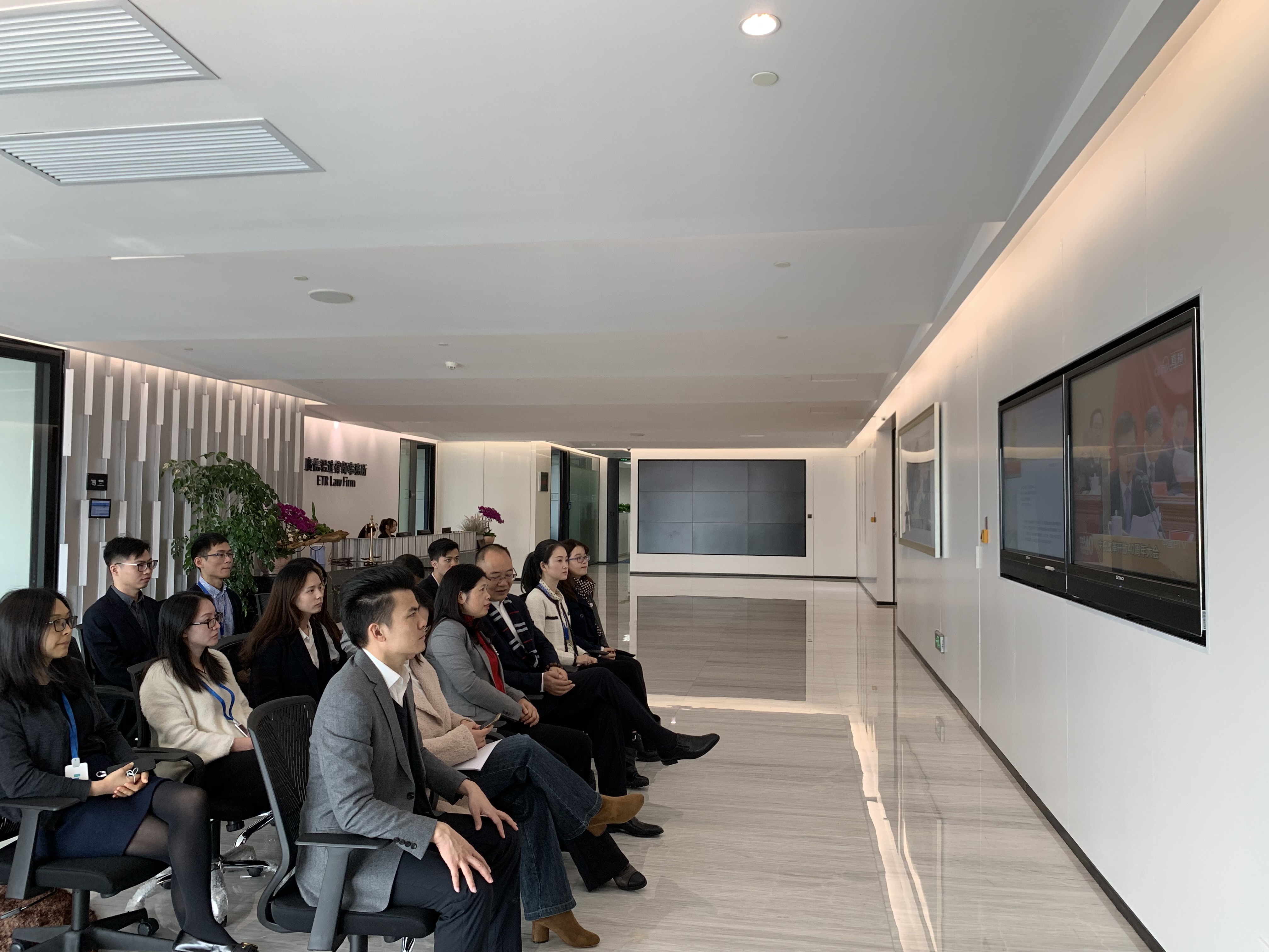 为庆祝改革开放40周年,广东广信君达律师事务所组织员工观看庆祝改革开放40周年大会直播,全所上下洋溢庆祝改革开放40周年的氛围。广信君达党委副书记邓传远、庄伟燕,党委青年委员兼党委办公室主任李晓月、第一党支部书记杜晓佳及其他律师员工共同在大厅观看直播。