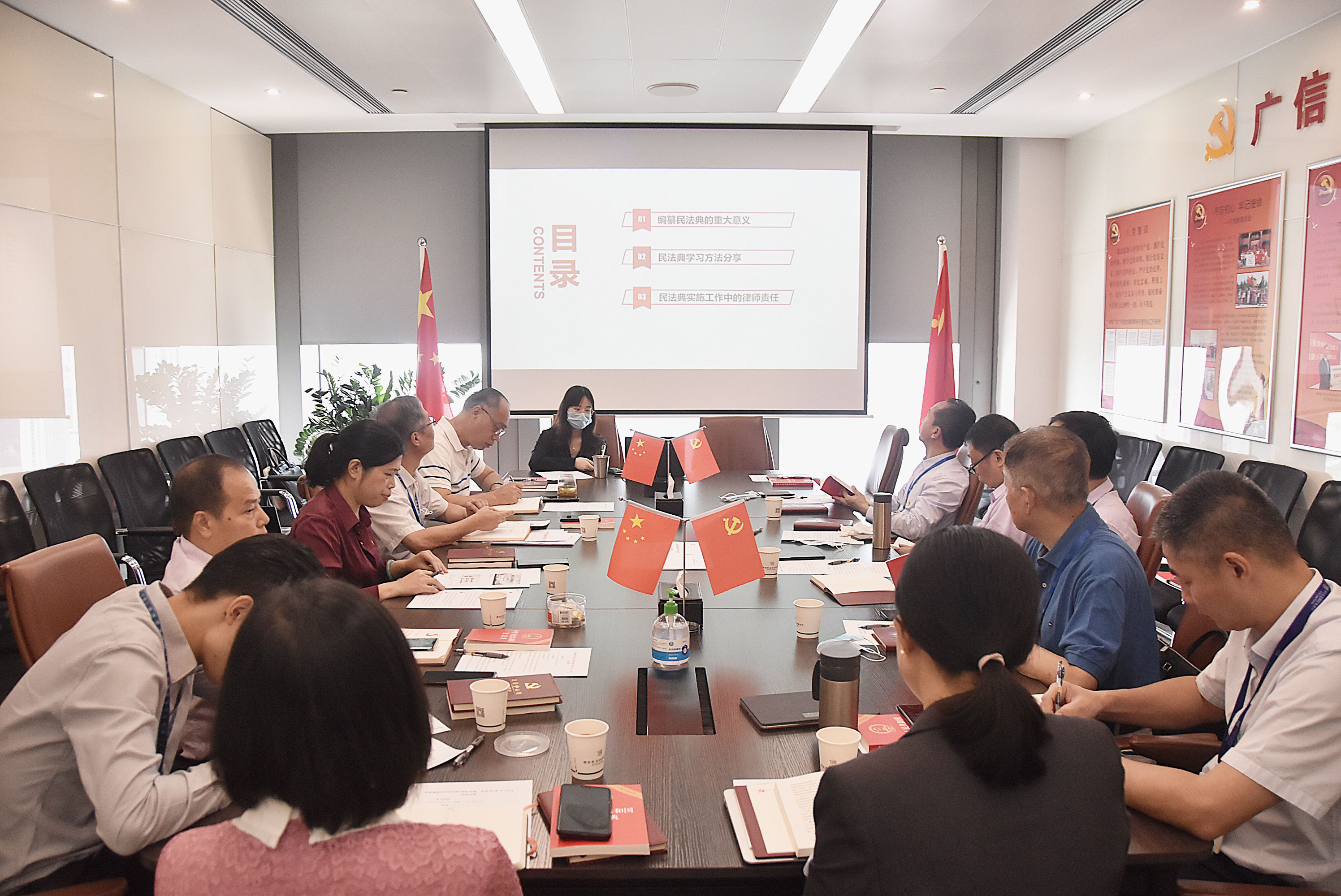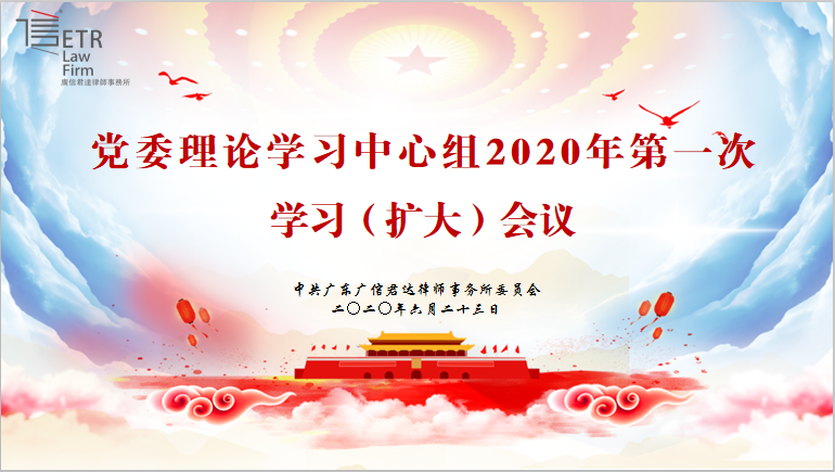 为深入学习全国“两会”精神,发挥律师职能作用,积极学习宣传实施民法典,让律师队伍成为普法宣传的中坚力量,根据广州市律师行业党委的部署和要求,结合我所党委工作安排,2020年6月23日,中共广东广信君达律师事务所委员会在党团活动室召开党委理论学习中心组2020年第一次学习(扩大)会议。广信君达党委书记章勋,副书记庄伟燕,党委委员黄永东、黄福轩、何雁飞、张成勇等党委理论学习中心组成员参加会议。广信君达管理委员会主任苏东海、监事长刘善巧等管理机构主要负责人,各党支部书记列席会议。会议由党委书记章勋主持。