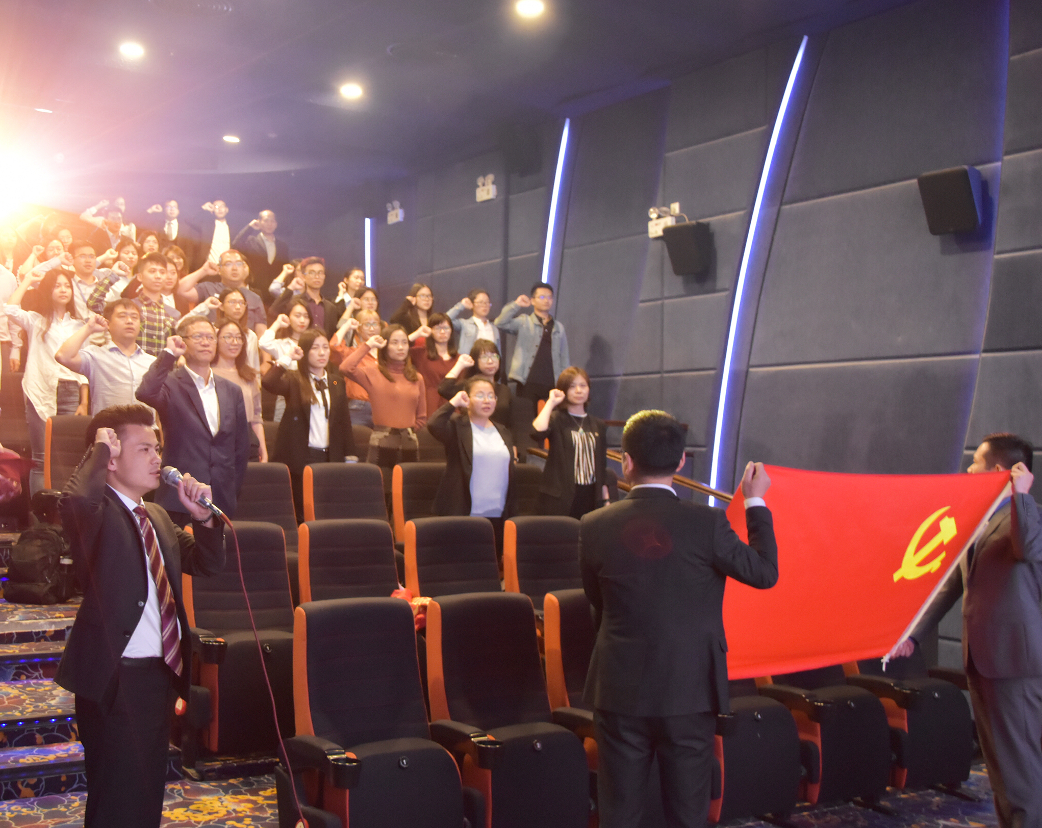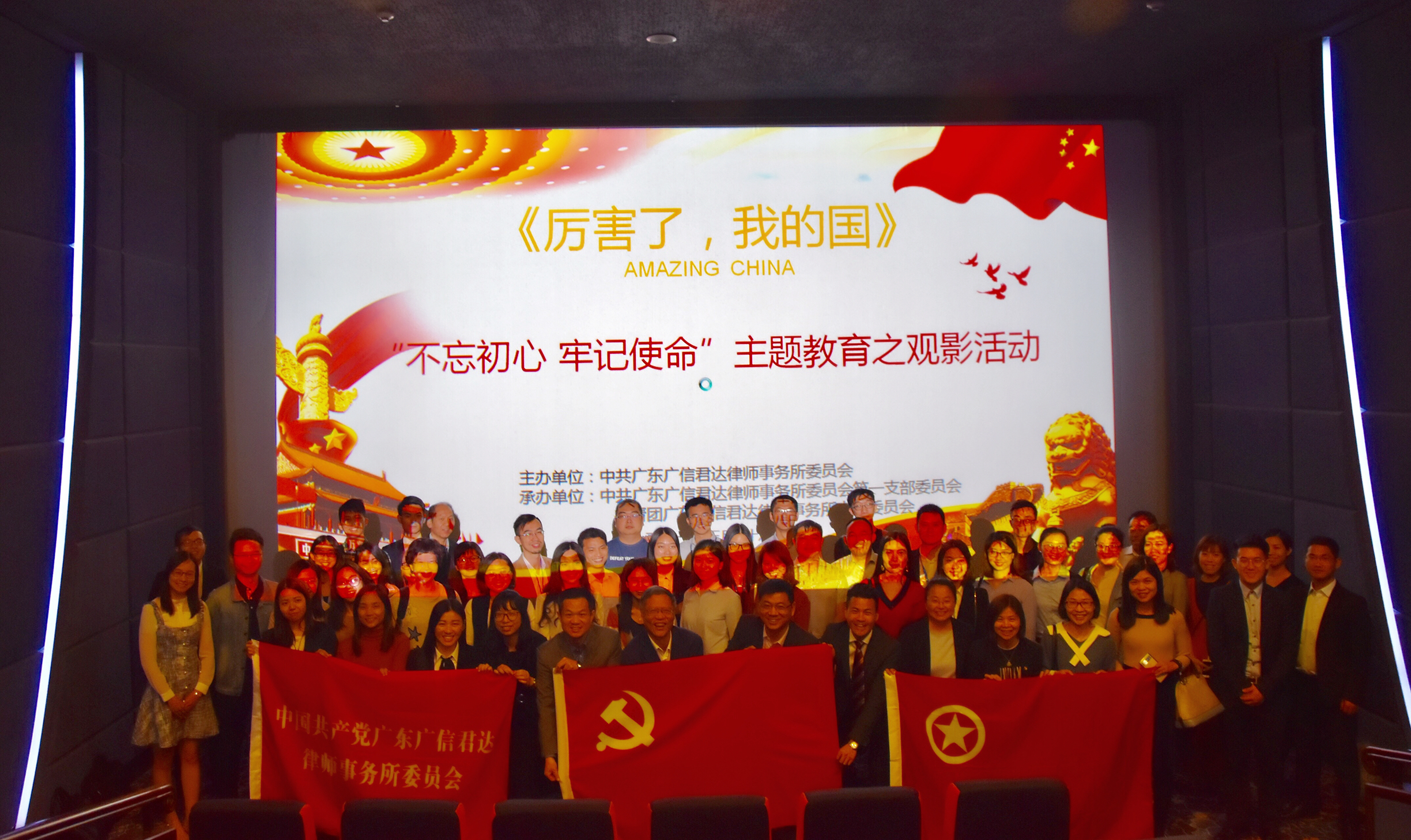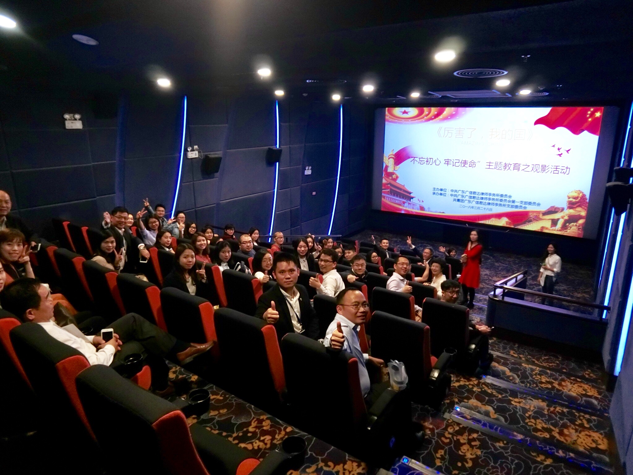为深入学习宣传贯彻习近平新时代中国特色社会主义思想和党的十九大精神,加强基层党的建设工作,深化中国特色社会主义和中国梦宣传教育,弘扬民族精神和时代精神,加强爱国主义、集体主义、社会主义教育,2018年3月28日,由中共广东广信君达律师事务所委员会主办、中共广东广信君达律师事务所委员会第一支部委员会及共青团广东广信君达律师事务所支部委员会承办的“不忘初心、牢记使命”主题教育之观影活动,在珠江新城高德置地冬广场飞扬影城顺利开展。本次活动进行了观看《厉害了,我的国》纪录片、心得交流、重温入党誓词等环节。活动由广信君达第一党支部书记杜晓佳律师主持,广信君达党委书记章勋律师,第一党支部文体委员朱滔律师、组织委员蔡长建律师,团支部副书记刘同律师等七十余名党团员参加本次活动。
