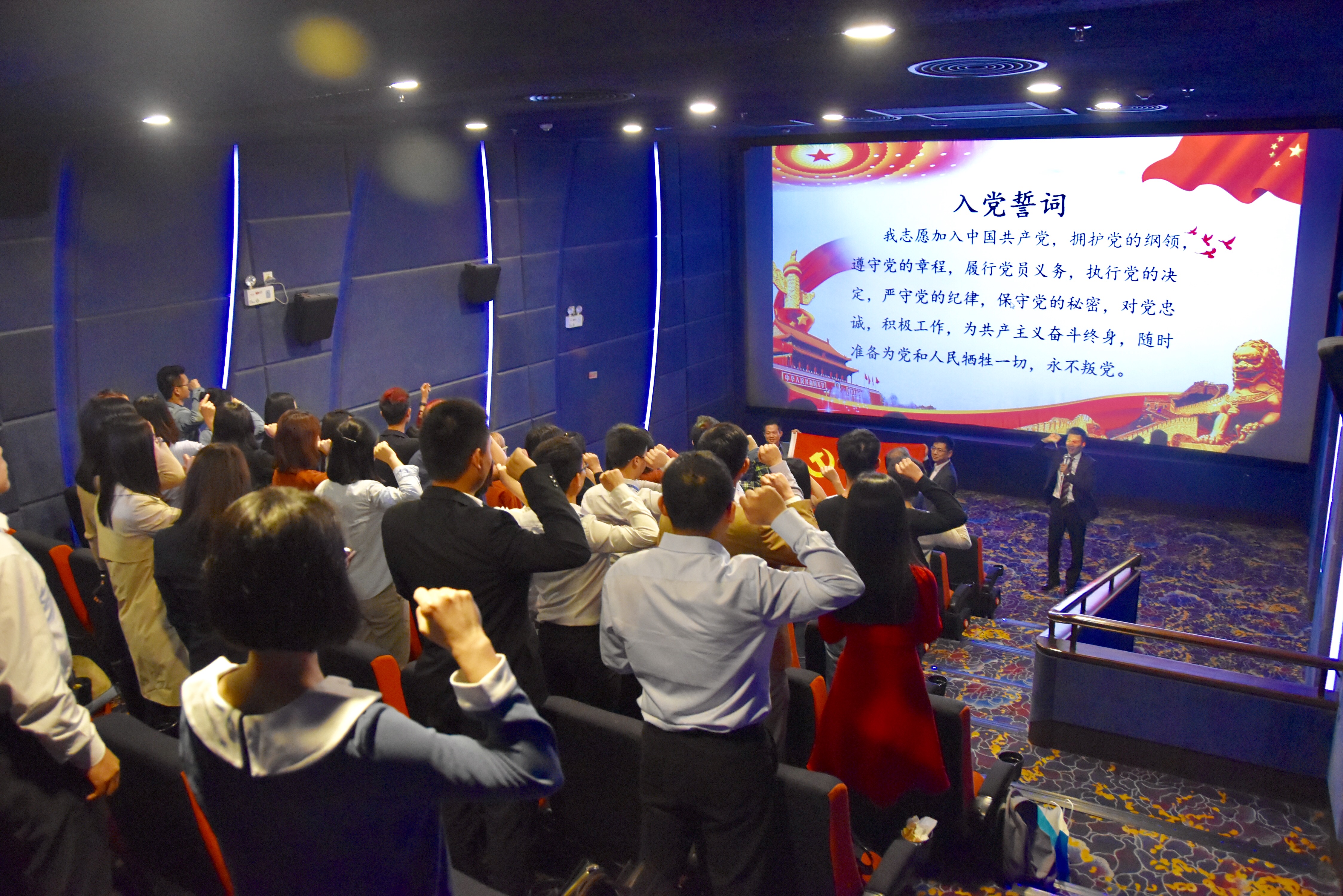 观影结束后,在座党团员倍感欢欣振奋,进行心得交流。最后,全体起立,在第一党支部书记杜晓佳律师作为领誓人的带领下,党员们举起右拳,面对鲜红的党旗,带着满满自豪感与使命感,铿锵有力地重温了入党誓词。