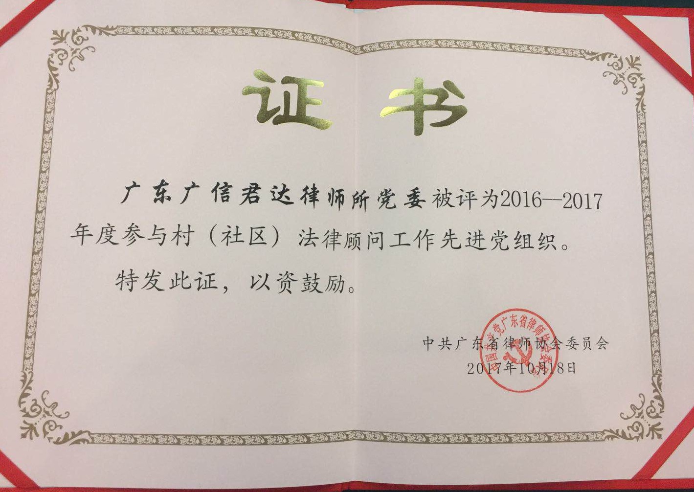 近日,广东律师行业表彰大会在穗召开。会上,广东省律师协会党委副书记、秘书长叶港宣读了对62个“参与村(社区)法律顾问工作先进党组织”和150名“担任村(社区)法律顾问优秀党员”的表彰决定,广东省司法厅党委副书记、副厅长、省律协党委书记梁震向20名领奖代表颁发证书。其中,广东广信君达律师事务所党委继2015-2016年度之后,再次获广东省律师协会党委“2016-2017年度参与村(社区)法律顾问工作先进党组织”荣誉证书。