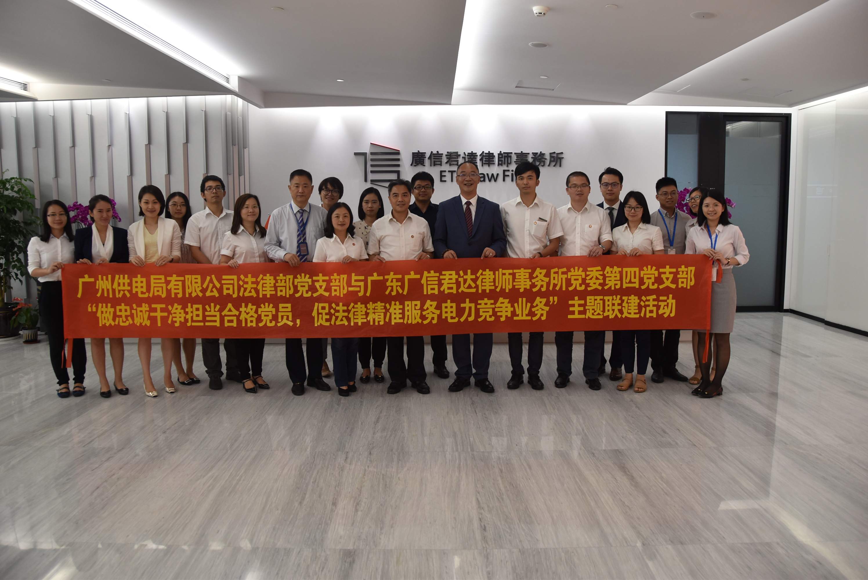 2017年9月14日下午,广州供电局有限公司副局长、机关党委书记杜满权、法律部党支部书记余平带领法律部党支部一行9人前往广东广信君达律师事务所党委第四党支部,开展主题为“做忠诚干净担当合格党员,促法律精准服务电力竞争业务”党支部联建活动。广东广信君达律师事务所党委副书记邓传远律师、第四党支部书记赵俊峰律师等12位律师参加了此次活动。