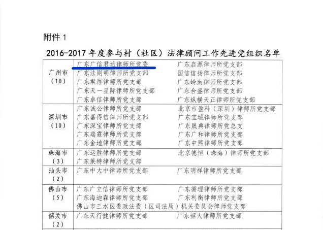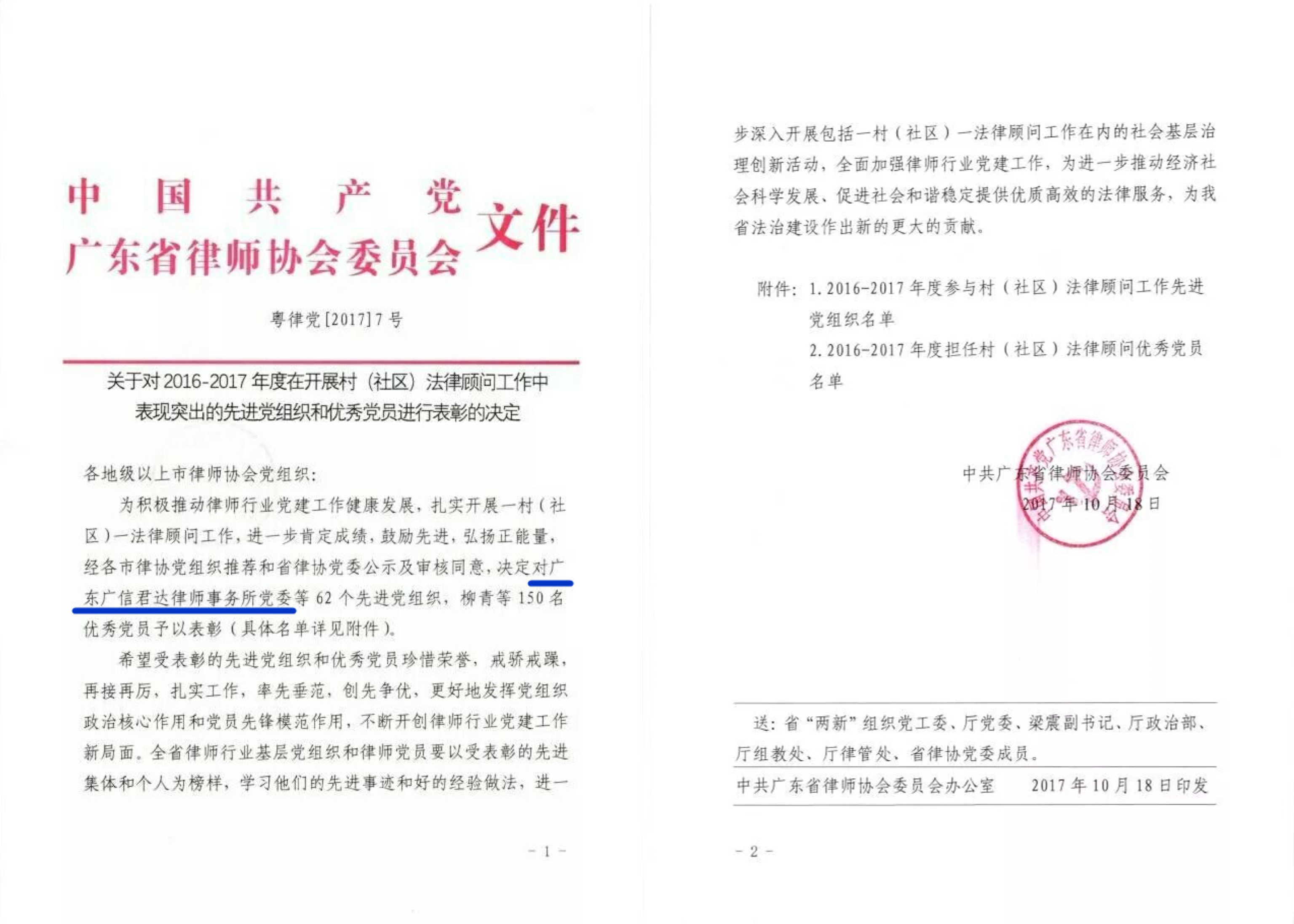 2017年10月24日,广东省律师协会官方微信号“广东律师之家”发布了中共广东省律师协会委员会《关于对2016-2017年度在开展村(社区)法律顾问工作中表现突出的先进党组织和优秀党员进行表彰的决定》(粤律党[2017]7号)(简称“《决定》”)。《决定》称,为积极推动律师行业党建工作健康发展,扎实开展一村(社区)一法律顾问工作,进一步肯定成绩,鼓励先进,弘扬正能量,经各市律协党组织推荐和省律协党委公示及审核同意,决定对广东广信君达律师事务所党委等62个先进党组织,柳青等150名优秀党员予以表彰。