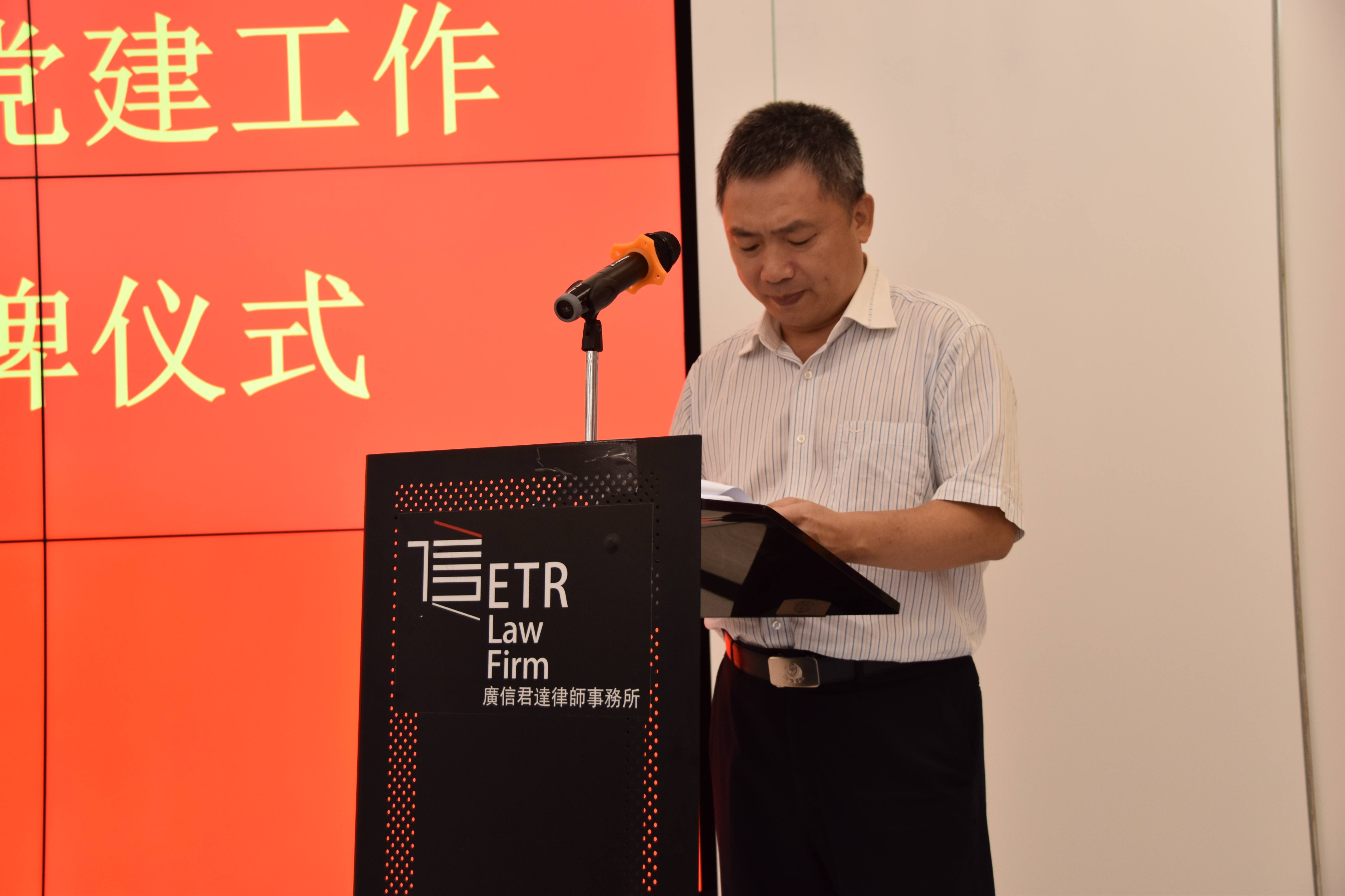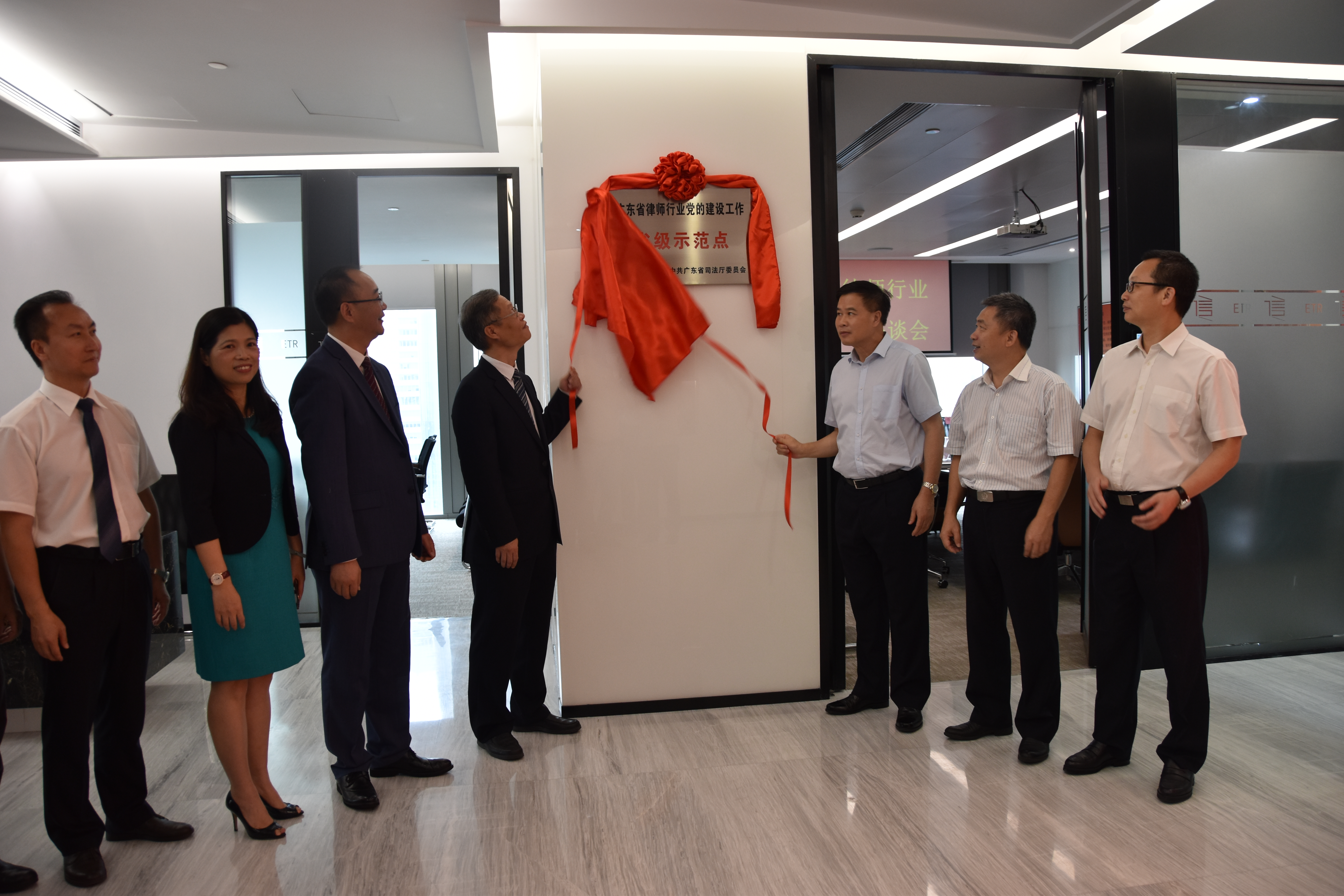 三时五十分,在梁震副厅长的主持下,授牌仪式正式开始。省司法厅党委委员、政治部主任谢昌晶宣读了关于确定全省律师行业党的建设工作示范点的通知。随后,曾祥陆厅长分别向广东广信君达律师事务所党委书记、广东宝城律师事务所党支部书记、广东天行健律师事务所党支部书记授予省级示范点标牌,并与广信君达所党委书记章勋律师共同为本所省级示范点标牌揭幕。