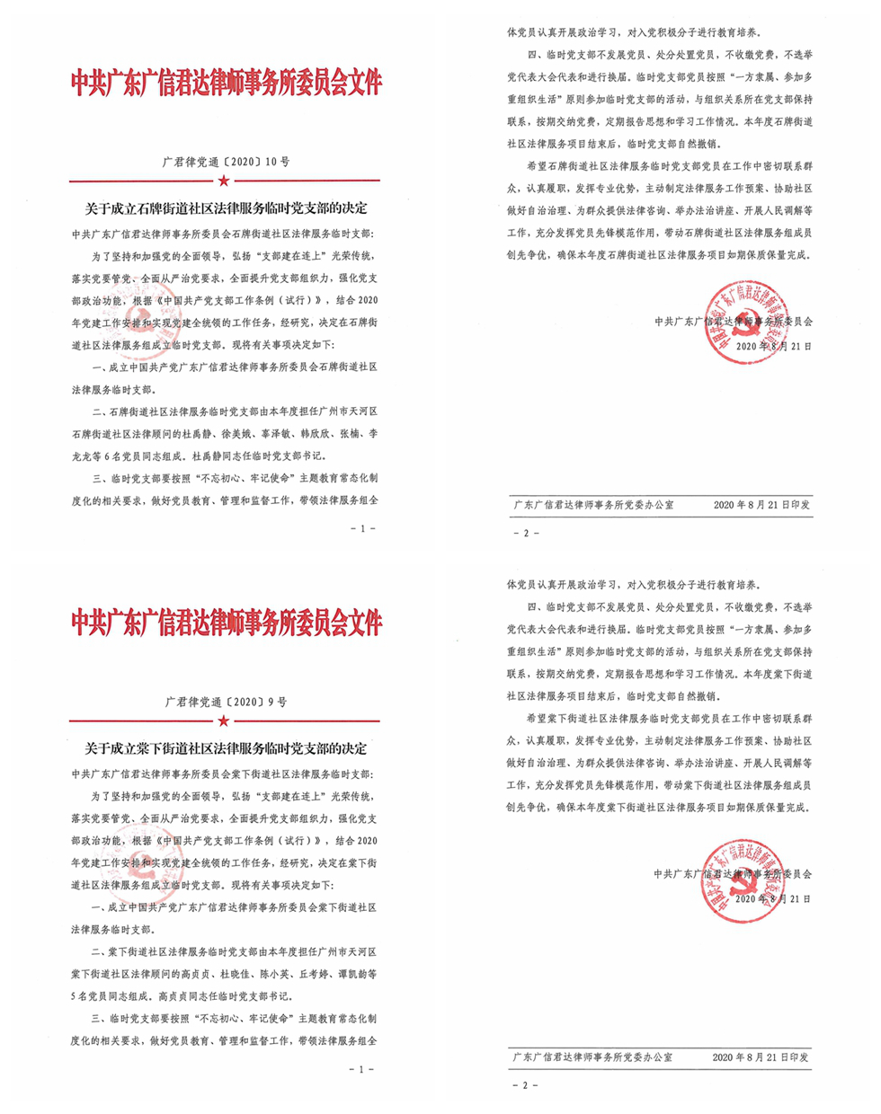 为了坚持和加强党的全面领导,弘扬“支部建在连上”光荣传统,落实党要管党、全面从严治党要求,全面提升党支部组织力,强化党支部政治功能,根据《中国共产党支部工作条例(试行)》,结合2020年党建工作安排和实现党建全统领的工作任务,经中共广东广信君达律师事务所委员会研究,决定在棠下街道社区法律服务组、石牌街道社区法律服务组成立临时党支部。