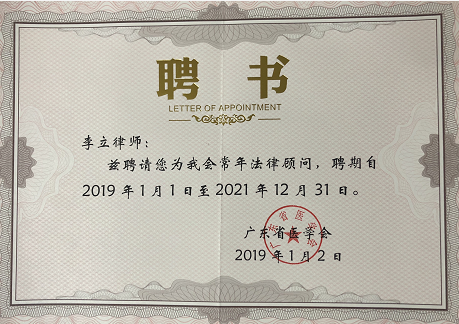 李立律师现为广州市律师协会医疗法律专业委员会副主任。担任广东省医学会、广东省医疗行业协会、中山大学附属第三、第五、第八医院、广州医科大学附属第一、第三医院、呼吸疾病研究所等单位常年法律顾问。