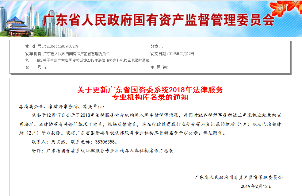 为进一步推动我省国有企业法务工作,防范和化解相关涉法风险,确保国有资产保值增值,根据《关于全面推进省属企业法治国企建设的意见》(粤国资综合〔2017〕8号)的相关规定,广东省国资委更新完善了广东省国资委系统法律服务专业机构库入库机构名录。