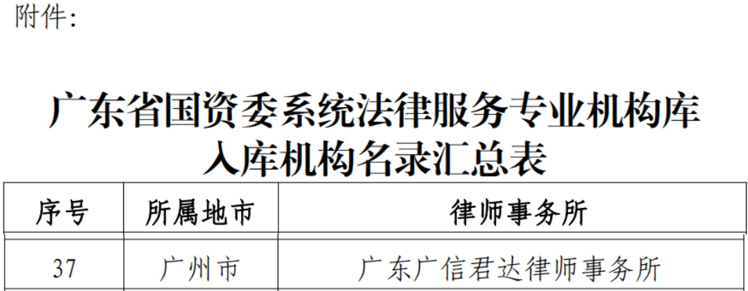 近日,广东省人民政府国有资产监督管理委员会(以下简称“广东省国资委”)公布了《广东省国资委系统法律服务专业机构库更新名录》,广东广信君达律师事务所通过严格审核,再次成功续聘为广东省国资委系统法律服务专业机构!