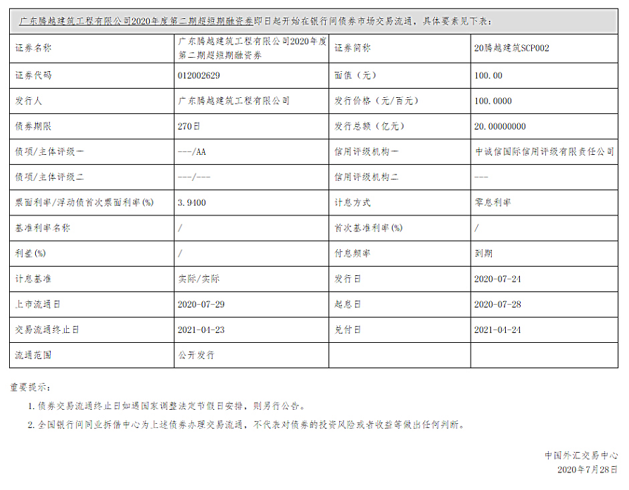 广东腾越建筑工程有限公司(简称“腾越建筑”)继2020年4月22日成功发行金额为人民币2亿元的2020年度第一期超短期融资券(疫情防控债)(证券简称:“20腾越建筑(疫情防控债)SCP001”)后,于7月24日成功发行2020年度第二期超短期融资券(证券简称:“20腾越建筑SCP002”),发行金额为人民币20亿元,票面利率为3.94%,发行期限为270天,由碧桂园控股有限公司(股份代码为2007.HK)提供担保,华泰证券、中国银行作为本次发行的牵头及联席主承销商。