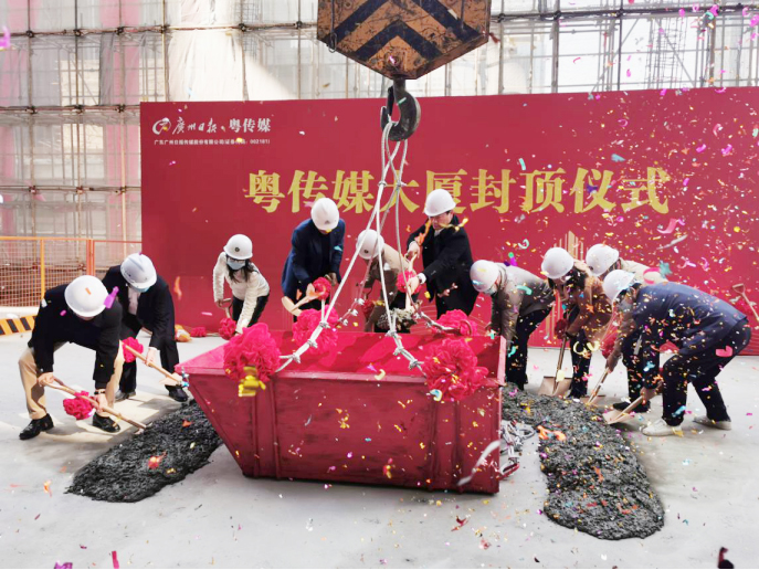 封顶仪式上,张强董事长宣布粤传媒大厦主体结构正式封顶,全场掌声响起。出席仪式的领导及嘉宾共同为项目主体结构封顶浇注最后一方混凝土,众多社会人士通过网络直播见证这一历史性时刻。粤传媒大厦主体结构封顶仪式庆典标志着项目建设取得重要的阶段性成果,为保证后续施工的顺利推进奠定基础。