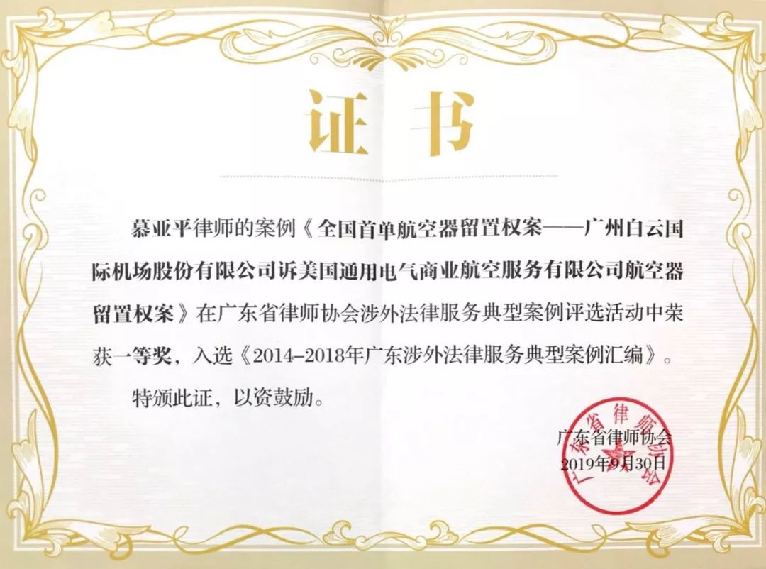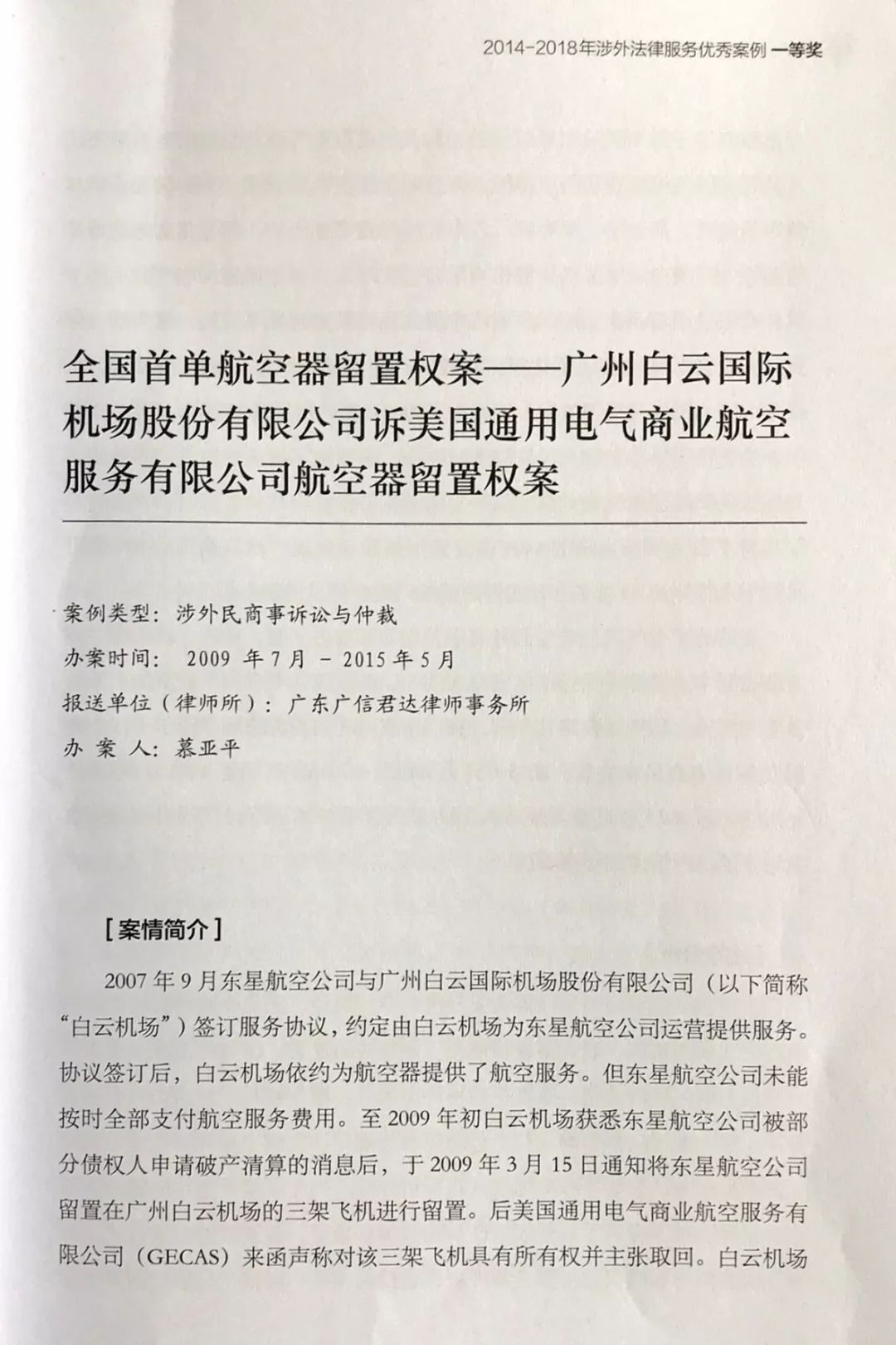 此次评奖中,广东广信君达律师事务所高级合伙人慕亚平律师及合伙人周莲律师参与代理的案件《全国首单航空器留置权案——广州白云国际机场股份有限公司诉美国通用电气商业航空服务有限公司航空器留置权案》荣获一等奖,并收录至省律协、广东省“一带一路”法律服务研究中心编印的《涉外法律服务典型案例汇编》。