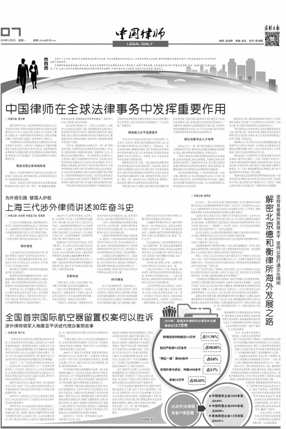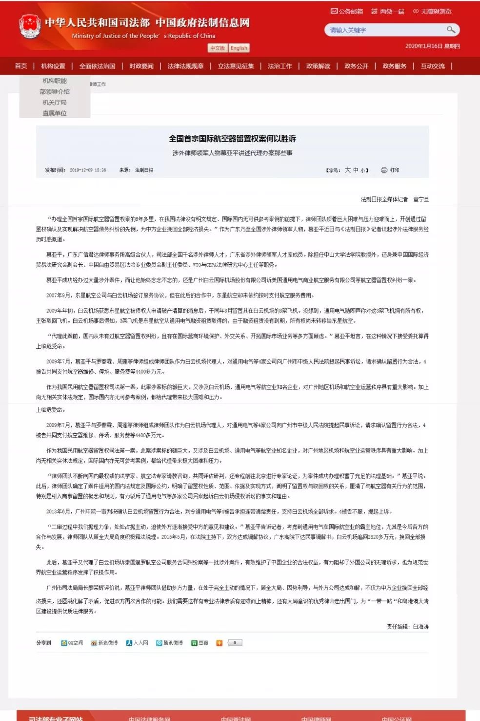 另悉在世界律师大会前夕,法制日报记者采访了作为广州地区世界律师大会正式代表的慕亚平律师,并于2019年12月9日在《法制日报》“中国律师”专版中以《全国首宗国际航空器留置权案何以胜诉》为题,全文刊载并推广此经典案例。12日,司法部官方网站全文登录该案例推介文章。