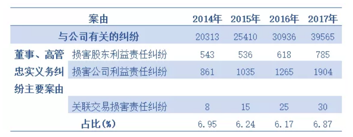 从上表我们可以看出,高管违背忠实义务损害公司利益的案件在与公司有关的纠纷中占有约6-7%的比例。[6]