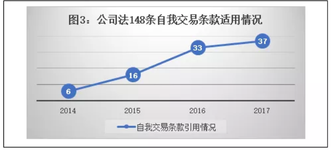 从上图我们可以看出,董事、高管涉自我交易纠纷的案件在违反忠实义务纠纷案件中占比23%,位列第二位,仅次于竞业禁止与篡夺公司商业机会案件。从纵向比较来看,引用第148条第一款第4项“自我交易禁止”条款进行裁判的118份裁判文书中,在2014年-2017年统计区间内呈明显上升趋势,具体如下图所示: