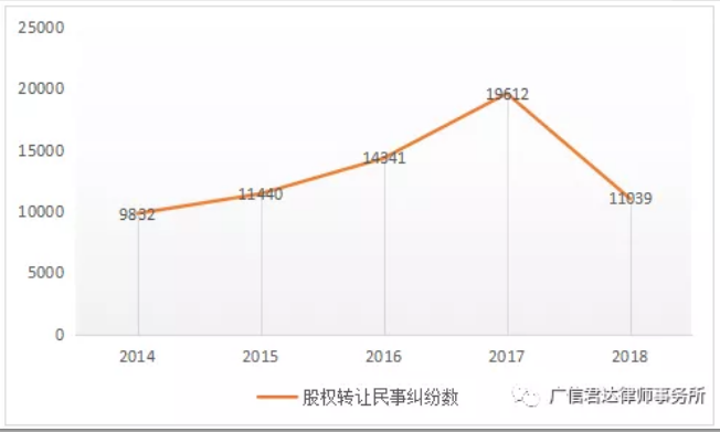 我们通过检索北大法宝数据库2014年1月1日到2018年12月31日的裁判文书,对这五年中与股权代持有关的案件纠纷进行统计,得到的结果如下图所示: