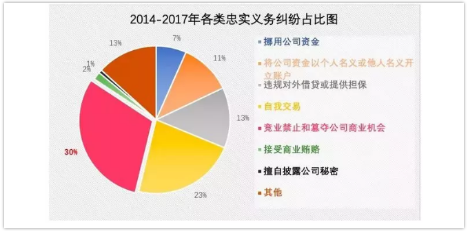 从上图我们可以看出,董事、高管涉竞业禁止与篡夺公司机会纠纷的案件在违反忠实义务纠纷案件中占比30%,位列第一。