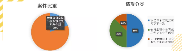 正如前文所述,由于股东协议和公司章程同时处于有效状态的情况是存在的,那么一旦股东协议与公司章程在内容上存在差异,准确地说,对于同一事项规定了不同的处理方式,纠纷随之而来。我们以2018年广东省高级人民法院审结的案件为样本,以“公司章程”为关键词搜索,涉及公司章程的裁判文书共41份,其中涉及到股东投资协议和公司章程规定差异产生的纠纷案件占比20%,具体统计情况如下图所示: