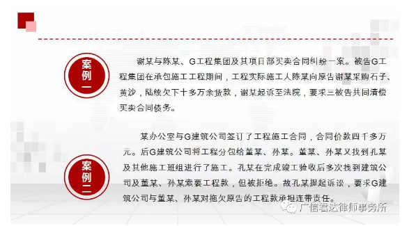图一的案例,案例一中法院认为适用合同相对性,认定买卖合同当事人为谢某和陈某,鉴于合同之债具有相对性,只对合同当事人产生约束力,对合同当事人以外的第三人不发生法律效力,故买受人陈某应承担给付货款义务,被告G工程集团及其项目部不承担付款义务。案例二中法院突破了合同相对性,认定孔某作为实际施工人,已按约定完成工程内容,并且竣工验收,董某、孙某应当将欠付的工程款给付孔某,G建筑公司作为工程承包人,应与董某、孙某承担连带给付责任。