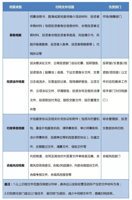 从私募基金的一般业务流程来看,与私募业务活动相关的档案可大致分为募集档案、投资运作档案、行政事务档案、合规风控档案,针对上述四类档案,具体的归档文件范围及建议归档负责部门如下: