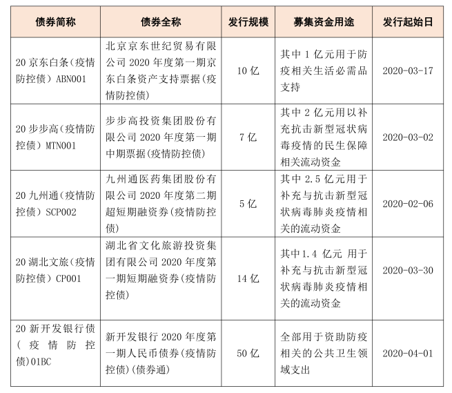对于募集资金用于疫情防控相关且金额占当期发行金额不低于10%的债务融资工具均可添加“(疫情防控债)”标识。若募集资金全额用于疫情防控相关,则可添加“(疫情防控专项债)”标识。其中债务融资工具包括短期融资券(CP)、超短期融资券(SCP)、中期票据(MTN)、非公开定向债务融资工具(PPN)、资产支持票据(ABN)、绿色债务融资工具(GN)等。交易商协会明确指出鼓励并支持有实际疫情防控需要的企业在发行时添加“(疫情防控债)”标识。