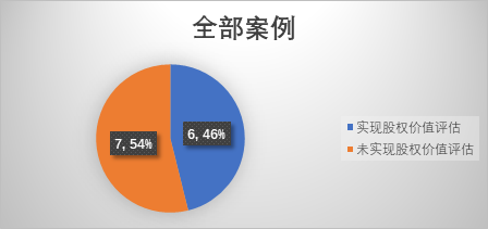 以“股权价值评估”、“执行”、“广东省”作为关键词在“无讼”案例系统进行案例检索,共检索到案例24个,经筛选其中直接相关案例13个。精读后确定实现了股权价值评估的案例为6个,未实现股权价值评估的案例为7个,未实现股权价值评估的比例为54%。