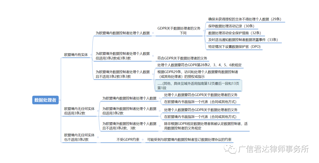 值得一提的是,当数据处理者不在欧盟境内,在认定数据处理者是否适用该规定时,要看数据处理活动是否与数据控制者针对性活动相关,数据处理者代表或为了数据控制者的针对性活动而处理数据才受到GDPR规制。
