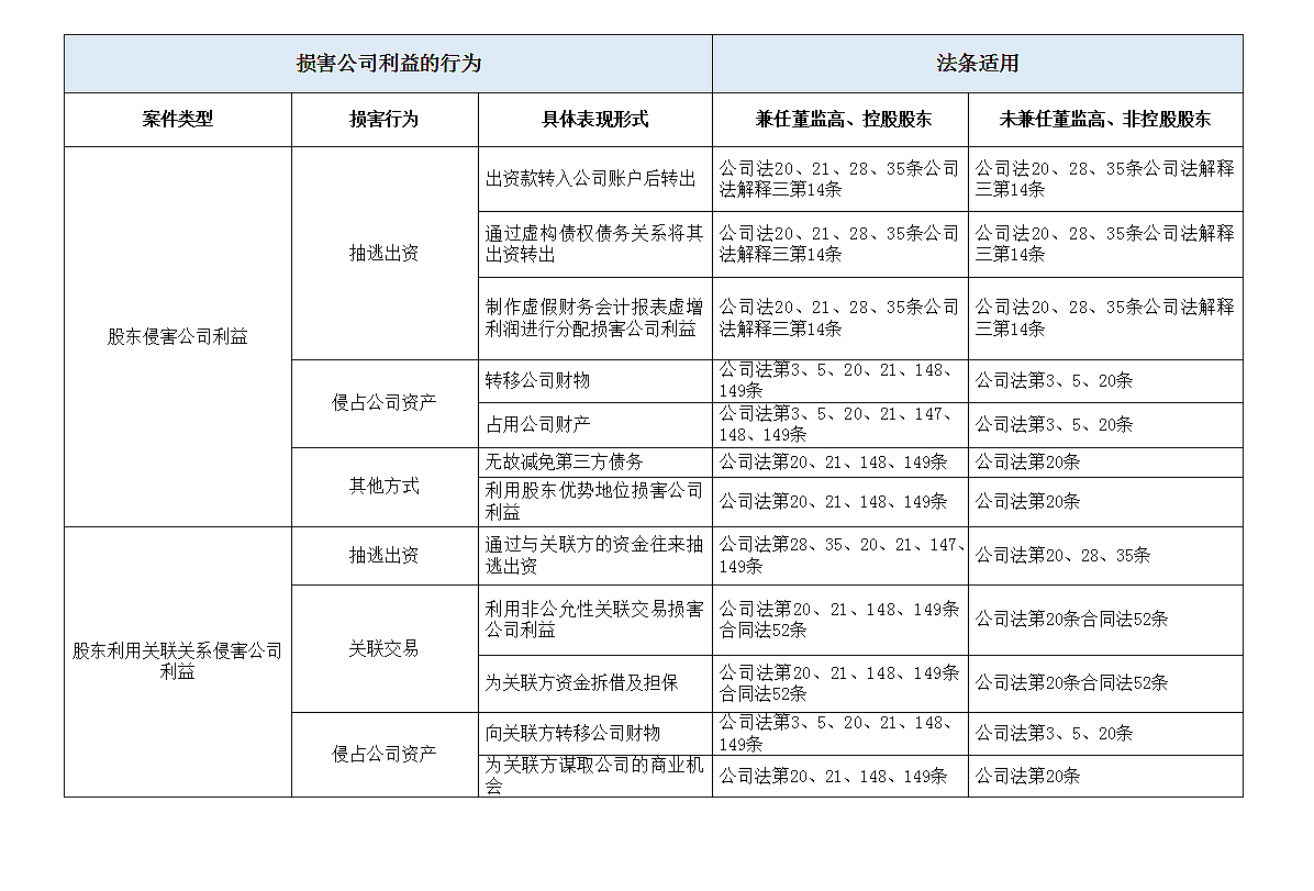如上文所述,“损害公司利益责任纠纷”与“公司关联交易损害责任纠纷”是股东侵害公司利益责任纠纷中最为常见的两类。我们结合现实案例中常见的损害行为表现形式,根据上述划分标准分析损害行为类型与法条适用的规律,如下表所示: