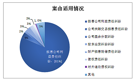 从图二可以看出,“损害公司利益责任纠纷”案由的适用比例最高。其他情况有5%的比例。其他情况主要是指没有明确的二级案由的案件,如成都鑫冠贸易有限公司与江西省中东投资有限公司、管中东与公司有关的纠纷案。
