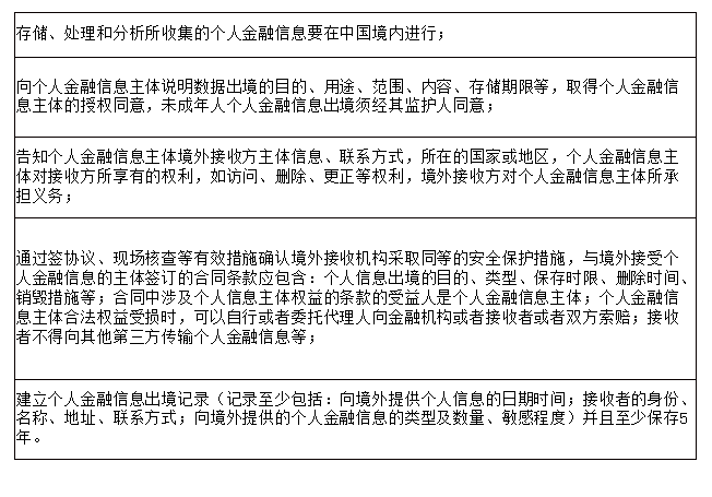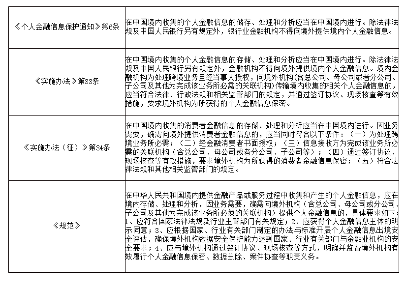 根据我国金融业特殊的监管规定,我们梳理了个人金融信息跨境传输的相关规定,具体为: