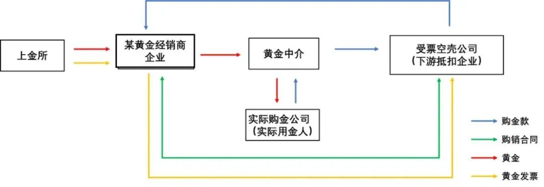 涉嫌黄金票罪,一般交易流程为:黄金中介通过一系列第三人联系受票空壳公司,获取受票空壳公司的发票信息;实际购金公司(或称实际用金人)将购金款通过黄金中介控制的银行卡转入受票空壳公司(或称下游抵扣企业)账户,以受票空壳公司名义与该黄金经销企业签订购金合同,由下游抵扣企业将购金款转入该黄金经销企业,制作虚假资金流,虚开专票。该黄金经销企业代购黄金后,黄金中介指示其提货人冒充数十家下游抵扣企业的员工在提货委托书上签字,由实际用金人将黄金取走;黄金中介指示提货人到该黄金经销企业领取专票转交他人,从而完成票货分离。