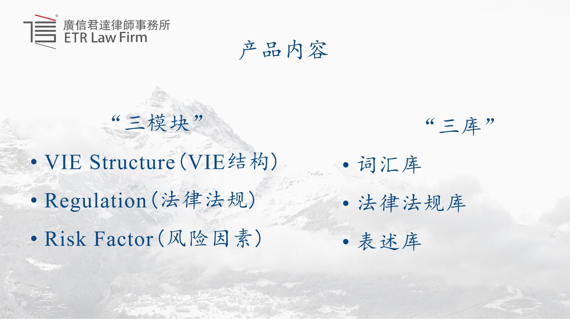 本法律服务产品,总结起来为两个“三”,即“三模块”和“三库”。
