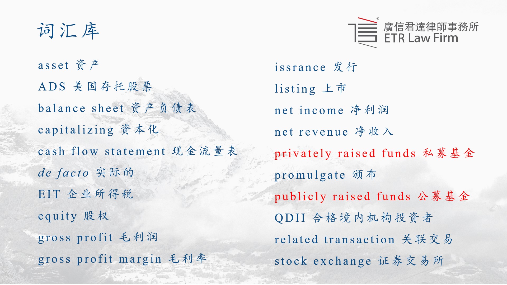 第一库为词汇库。在多年提供此项法律服务的过程中,我们总结了使用频次较高、且具有较大借鉴意义的单词或词组,并归纳入库,以中英文对照的形式呈现,其中包括涉及到金融专业领域的用语,以及在积累后总结出美国正式文件中的特别用法。其中有些用语为我们在服务过程中符合美式用语要求的创新。因中美经济、法律、文化的差异,很多中国法律术语在美式用语中没有相对应的表述,如公募基金。我们在查阅了大量中外文献后,最终确定统一使用Publicly Raised Funds,最终也是得到了SEC的认可并一直沿用至今。词汇作为语言的基础广泛使用在各个模块。