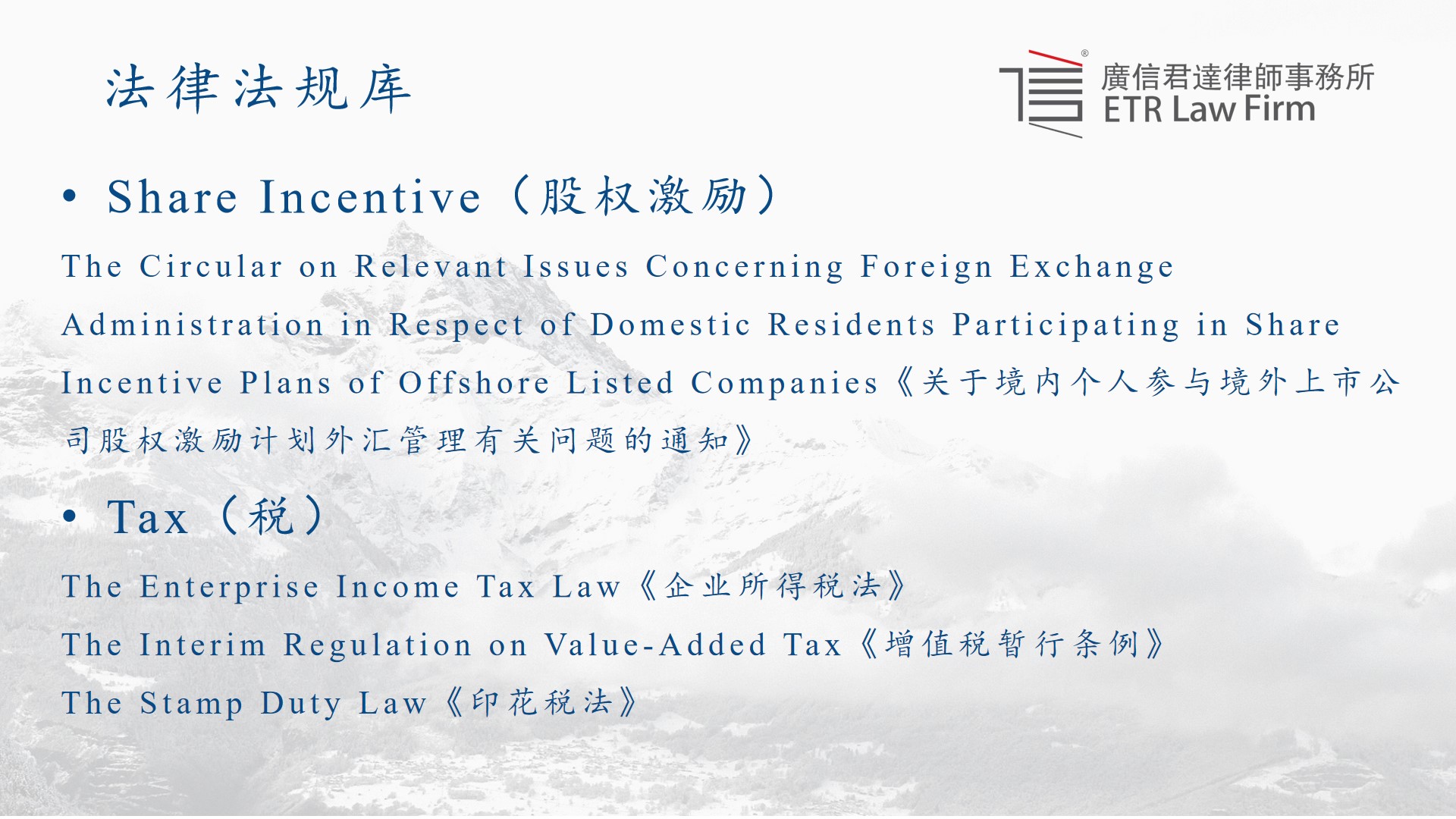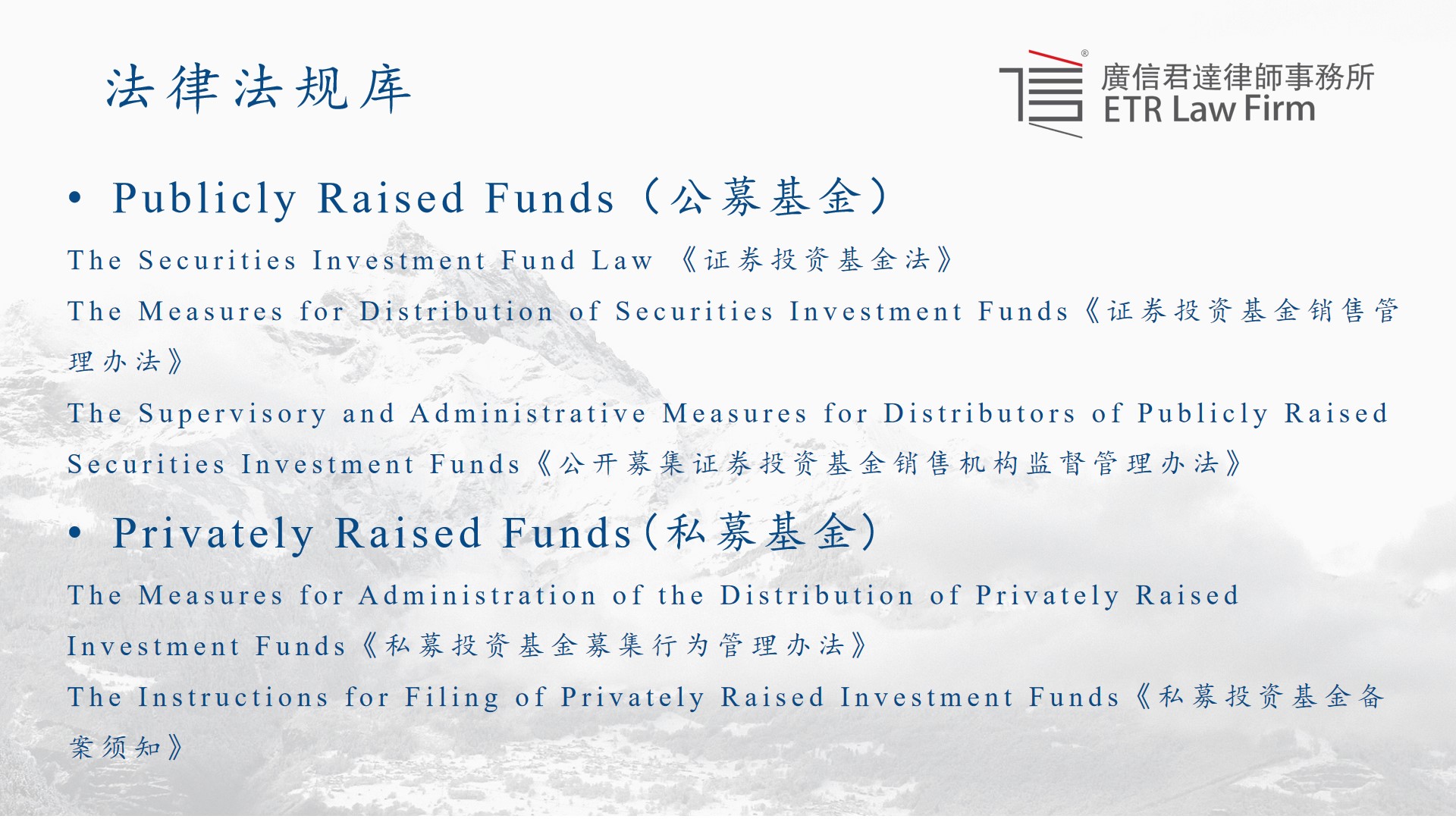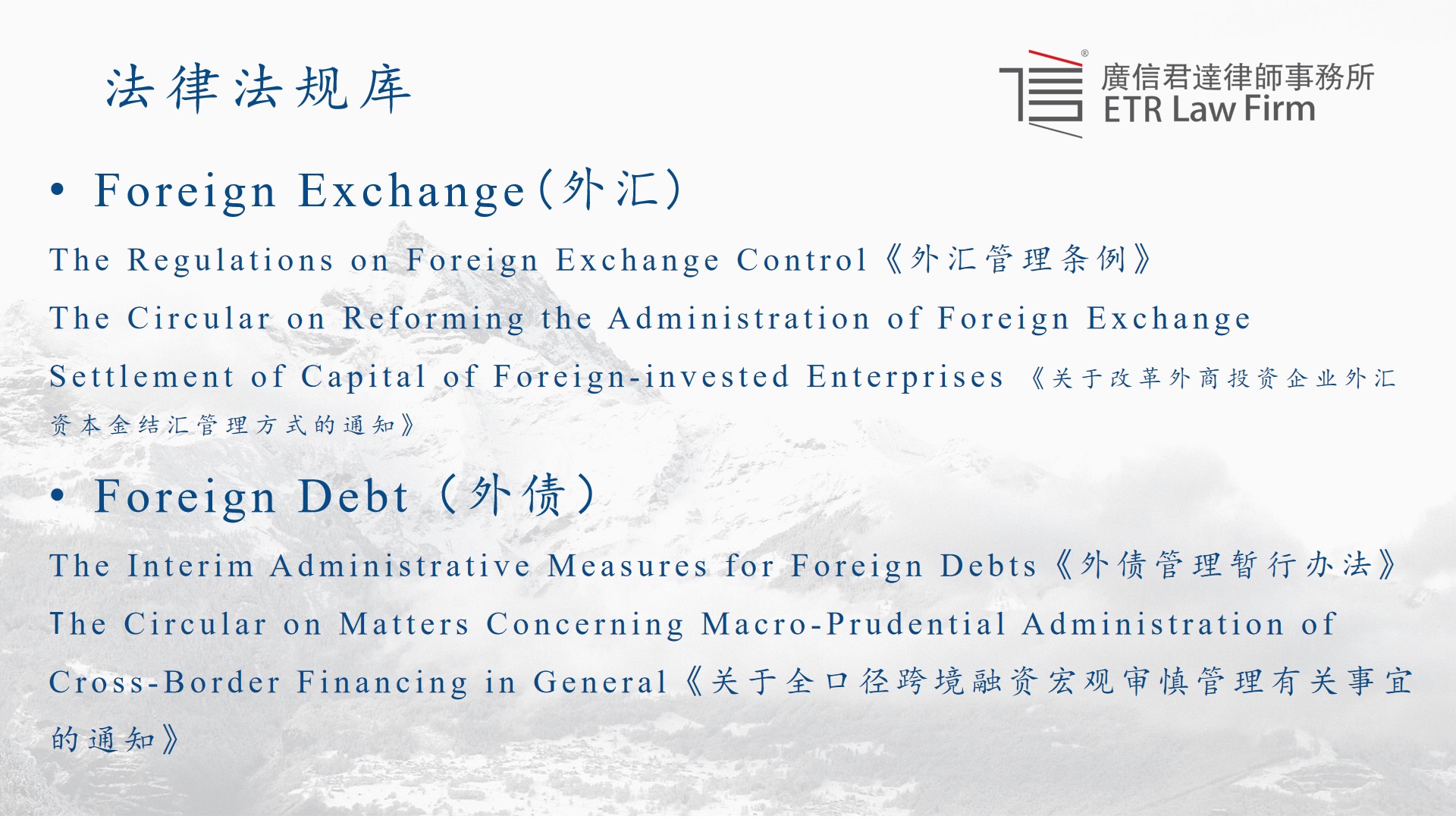 第二库为法律法规库。作为中国律师,对于法律法规的把握至关重要。在多年提供此项法律服务的过程中,我们将可能涉及到的中国法律法规进行了归纳总结并入库,结合年报法律法规模块相应的要求,按照领域划分,从法律的名称到颁布时间和内容都做到统一标准的中英文对照,其中包括法律、行政法规以及各部门、机构出具的各项通知。同时一直保持定期整理更新的状态,及时筛除失效的文件,补充新颁布的文件,包括草案及征求意见稿。在内容上,既包括针对不同金融公司主营业务不同的特殊领域,如基金销售,也包括同样在美国上市的其他中概股公司基本都会涉及到的如外汇、外债劳动和社会保险、税法等领域。