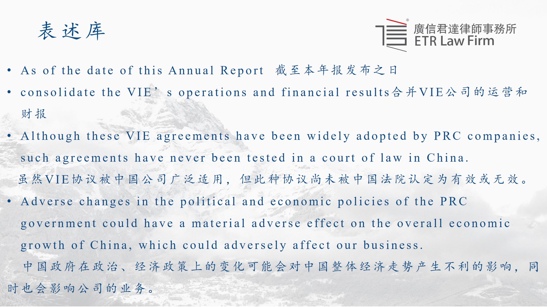 第三库为表述库。同样也是在提供此项法律服务的过程中并且借鉴参考了其他公司的年报及SEC的规范性文件而总结出的可以适用于大部分符合条件公司的一些表述,在年报的相应段落可以直接使用无需修改,其中包括一句话开头的表述以及一段完整的结论。年报的风险因素模块,可以看作是对上述两个模块的总结,将所有因VIE架构和法律法规可能导致的风险,披露给证券交易所面向的普通投资者,因此也是需要使用大量的观点性语句,从表述库中选择即可。