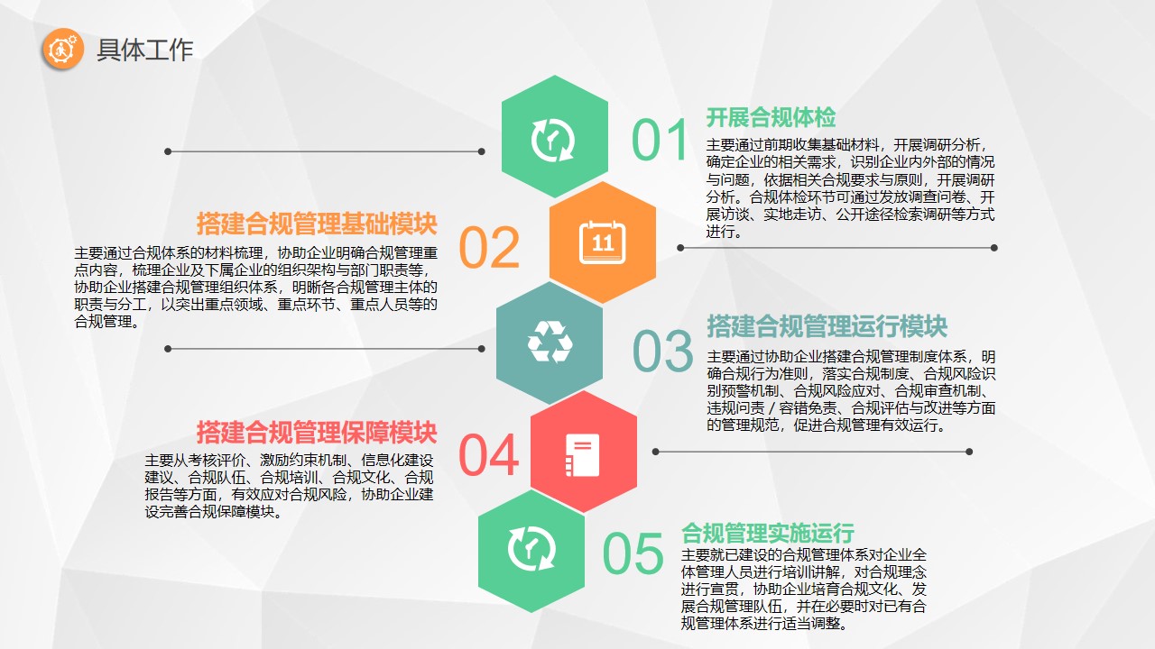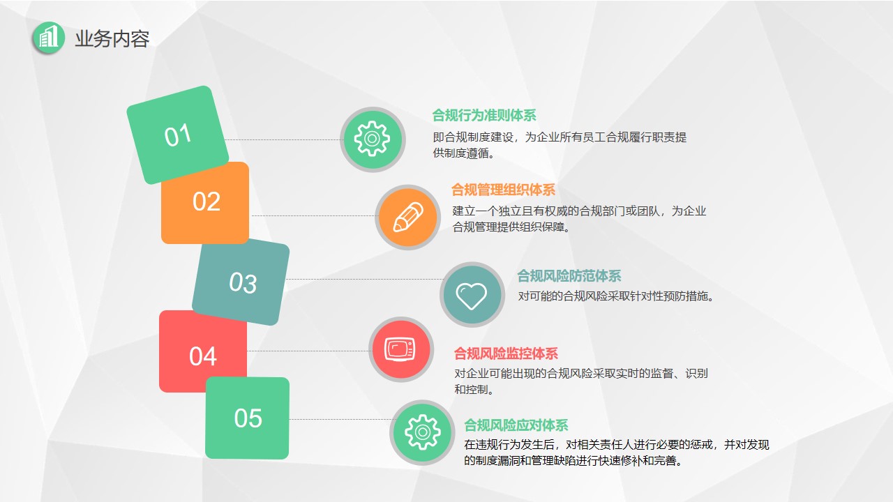 (1)合规行为准则体系。即合规制度建设,为企业所有员工合规履行职责提供制度遵循;