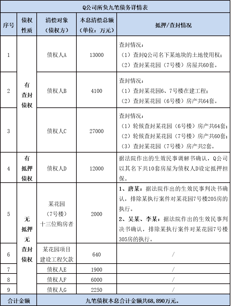Q公司成立于1987年,系具有房地产开发经营资质的国有企业。由于Q公司债务问题日益严重,上级部门将Q公司移交给S公司委托管理,S公司委托本团队为Q公司存在的债务清偿、债务重组和破产重整项目提供专项法律服务。接受委托后经核实确认,Q公司已陷入严重的资不抵债情形,经查证证实Q公司主要存在以下九笔债务: