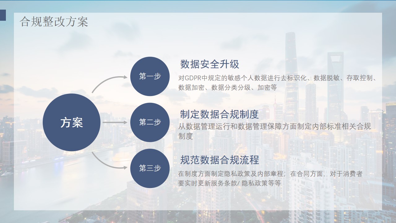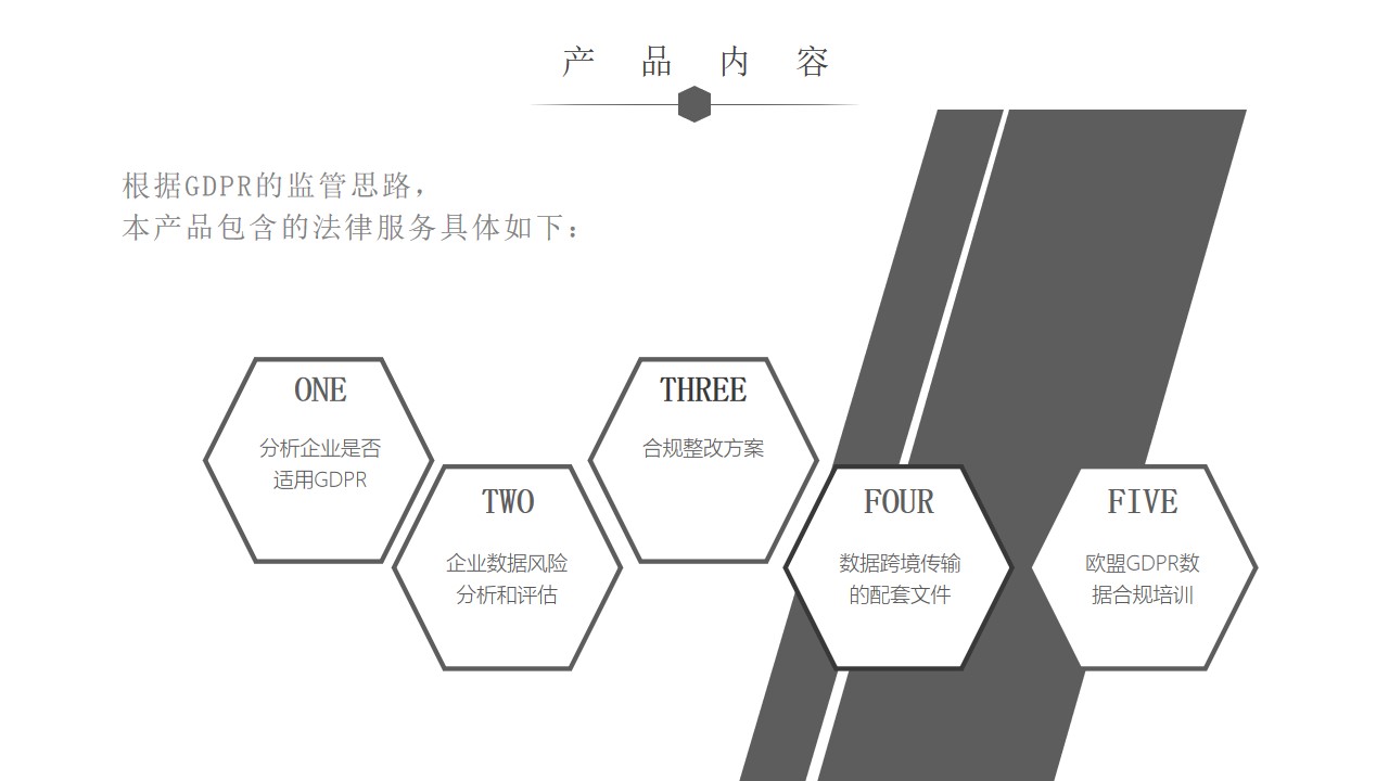 欧盟《通用数据保护条例》(General Data Protection Regulation,简称“GDPR”)对中国企业的影响逐步扩大,一是其扩张型的域外适用效力,因中国与欧盟的贸易关系十分密切、关联因素甚广,很多中国企业会列入GDPR的适用范围之内;二是其规定的苛刻的法律责任,企业可能会因合规管理不到位而面对巨额处罚的风险。因此,企业需要更加了解GPRD的合规要求,加紧建设符合GDPR合规要求的数据合规管理系统。据此,本产品应运而生,对内部数据合规到数据跨境传输等各方面进行分析,为中国企业实现“走出去”战略保驾护航。