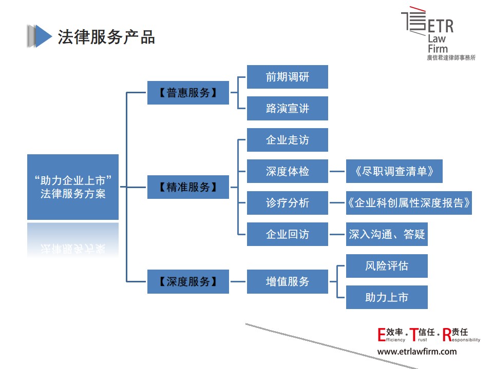 1. 企业走访,即企业初认识,由项目负责人带领团队上门为潜力企业开展一对一的走访,为企业详细介绍律所及服务团队的基本情况、服务过程及内容,并初步了解企业的基本情况和需求。在走访前,团队需做大量充分、细致的准备,根据企业公开的信息,对其所属领域的科创定位进行初步分析,并检索领域中相应的对标企业,对该部分企业在上市过程中所遇到的知识产权问题及答复进行研究,同时还需对企业现有的专利申请数量、商标注册数量等知识产权信息和目前面临的相关诉讼风险进行了梳理,最终给出初步建议。在走访过程中,与企业加深了解,加强信任,有助于建立良好的沟通渠道,促进项目顺利进行。