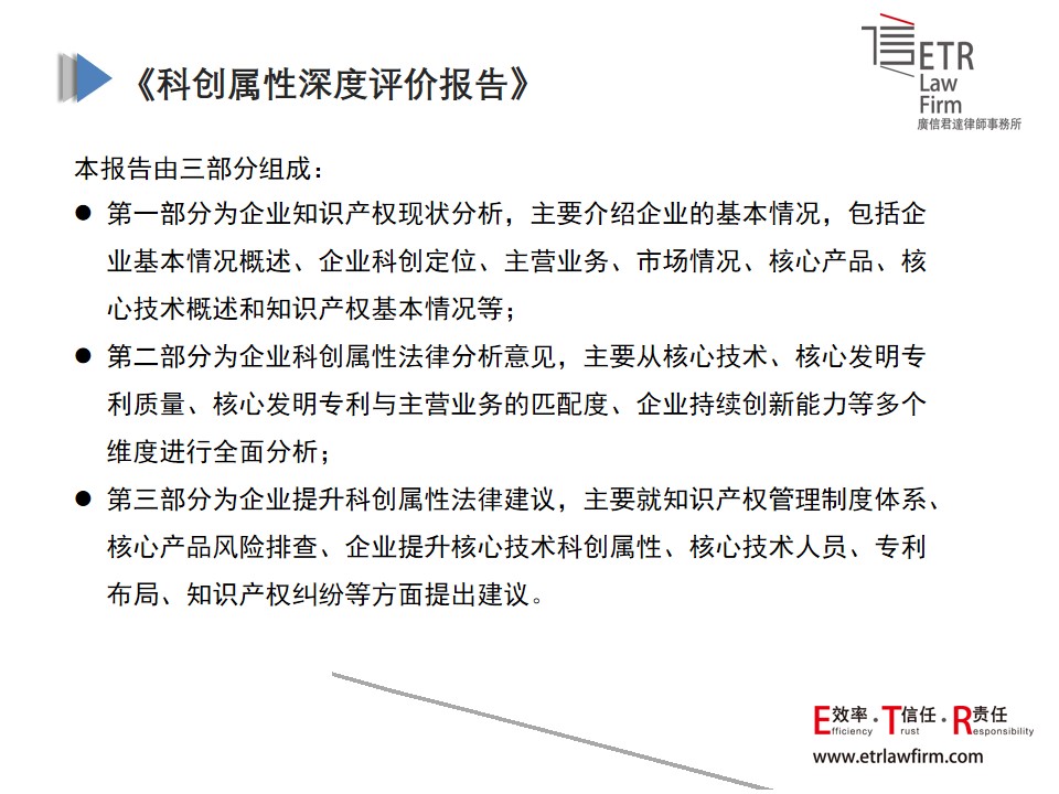 3. 在企业提供资料后,团队将持续地对企业进行走访、调查,进一步了解企业技术研发以及知识产权工作情况,结合“4+5”科创属性指标,有针对性地对重点问题进行分析和评估,最终形成企业的《科创属性深度评价报告》。
