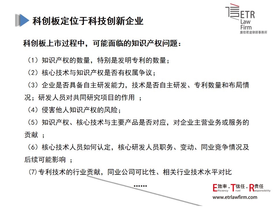 根据科创板上市的前期调研,知识产权问题历来是上海证券交易所关注的重点。科创板上市过程中涉及知识产权工作的问题不仅数量多,而且非常深入、全面,据不完全统计,有50%的企业因为知识产权问题没有成功上市。