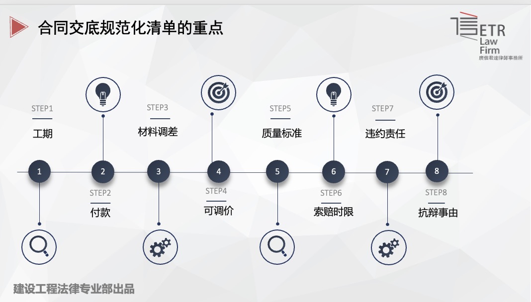针对建筑行业的从业人员来说,相比文字,他们更愿意与图纸、材料、数字打交道。这就造成现实中很多施工管理人员对合同条款的理解是极为陌生和浅显的,全凭经验和感觉在管理合同的履行,对涉及企业权利与义务的计价标准、支付进度、竣工结算、违约责任等知之甚少。这种合同文字条款的短视,往往潜藏着巨大的经济隐患。完备的书面合同和到位的合同交底,是保障施工项目管理和交易安全的重要工具。在签订合同前,本产品能协助建筑企业就合同内容进行全面磋商,对施工范围、工期、付款、技术要求、质量要求、施工方案、双方权利义务、违约责任、竣工结算、争议解决、索赔时限等重要条款以书面方式予以明确,并争取形成对相关企业最有利的文字表述。若能在合同中有效减少约束性条款,在结算时则有望将风险控制到最低。