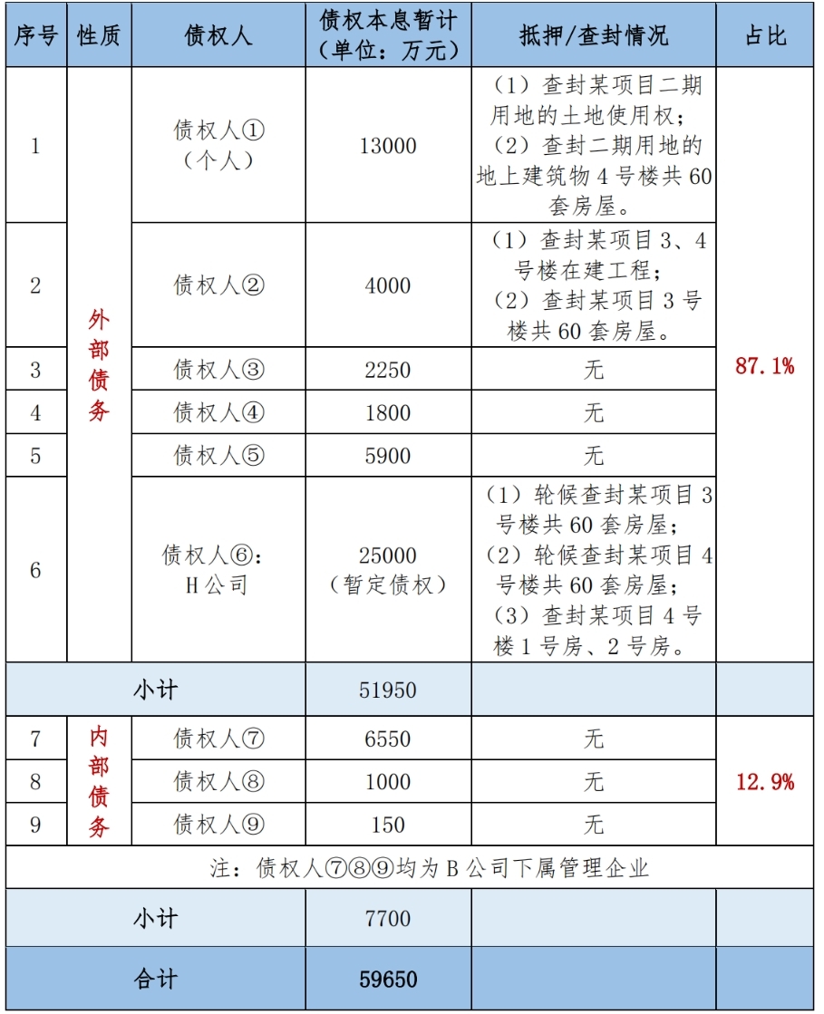 2. 根据承办律师核查及核算,A公司共有九笔债务,债务本息金额暂合计约5.96亿元,其中包括外部债务共六笔,本息合计约5.19亿元;内部债务共三笔,本息金额合计约7700万元。