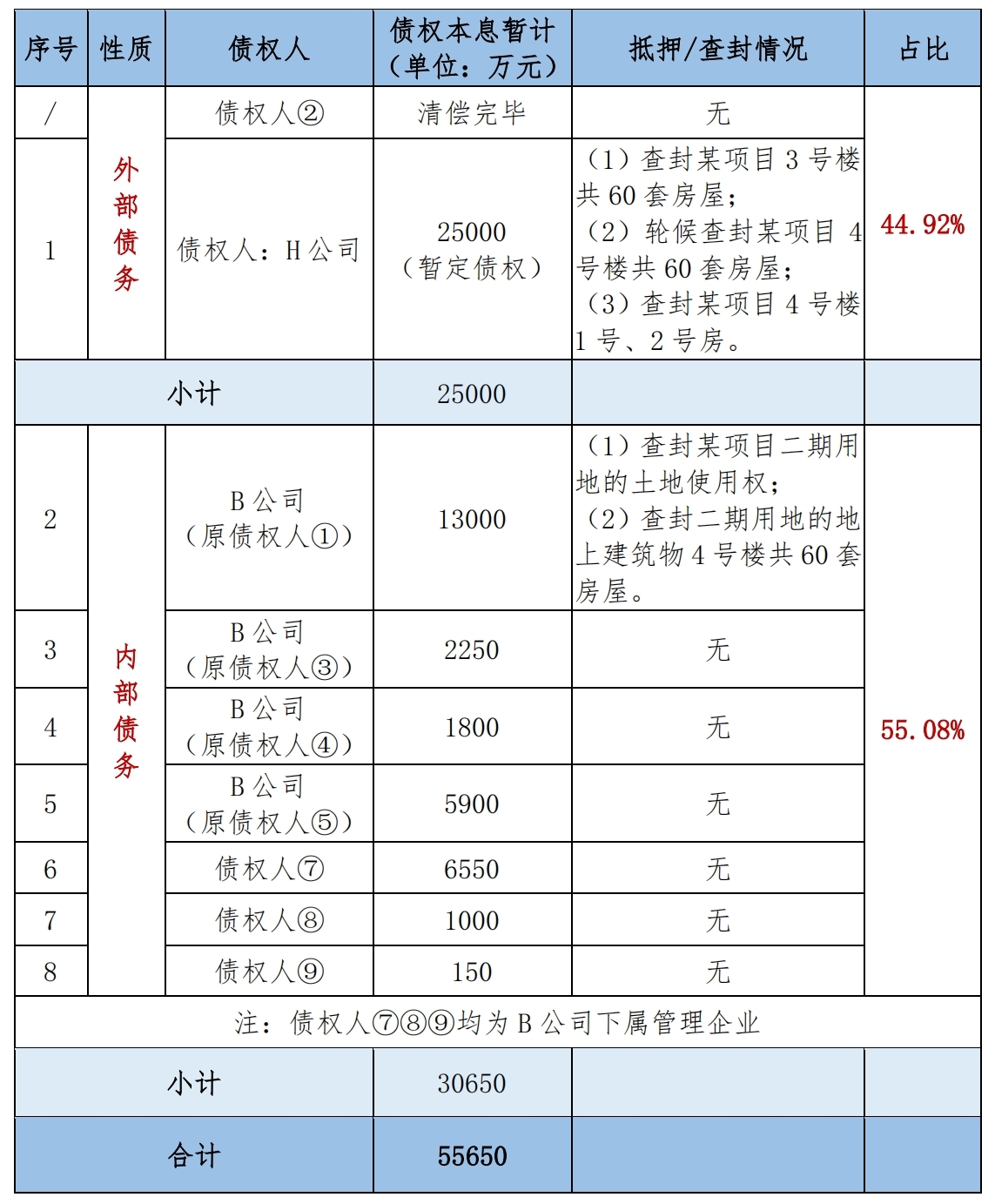 经笔者团队核查,B公司本次受让外部债权人①、③、④、⑤对A公司享有的四笔债权,整体上真实、合法、有效。经过债权转让及清偿部分债务后,B公司及下属管理企业对A公司的债权共计为3.065亿元,H公司对A公司的债权(暂按一审判决结果)为2.5亿元,即A公司目前仅有B公司、H公司两名债权人,债权比例分别为B公司55.08%、H公司44.92%。