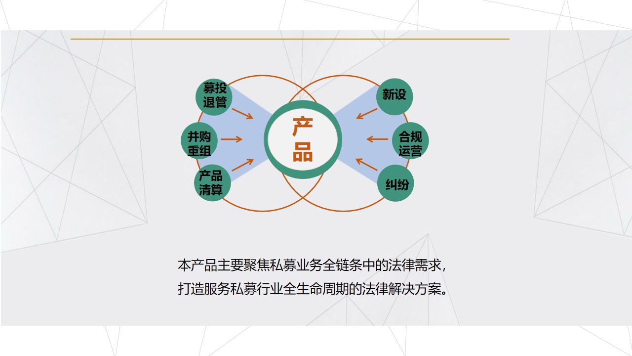 本产品主要聚焦私募业务全链条的法律需求,涉及新设登记、运营合规及纠纷解决等方面,打造服务私募行业全生命周期的法律解决方案。