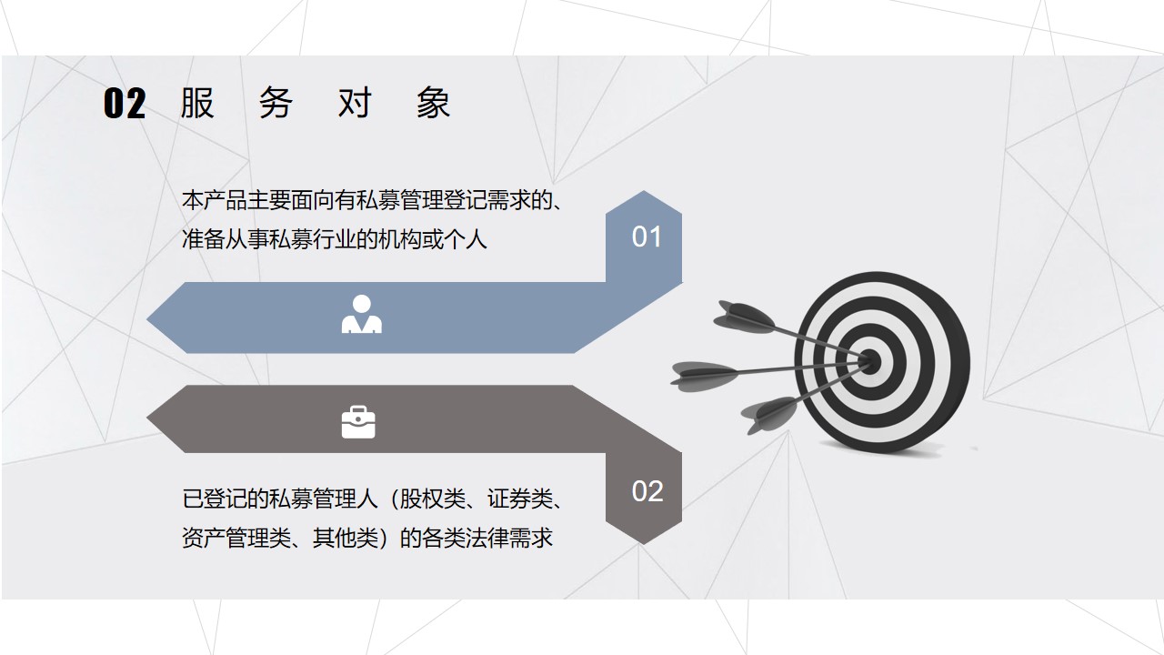 本产品主要面向有私募管理登记需求的、准备从事私募行业的机构或个人,以及已登记的私募管理人(股权类、证券类、资产管理类、其他类),提供服务以满足其各类法律需求。